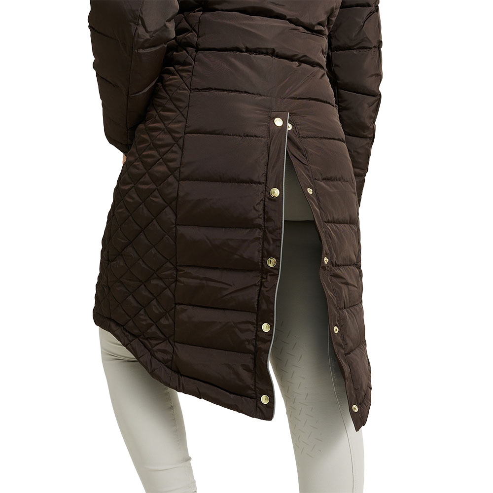 Denna vackra figursydda kappa är designad med ett dunliknande syntetiskt foder som värmer dig skönt under kalla dagar. Kappan är knälång och har en öppningsslits bak med tryckknappar.