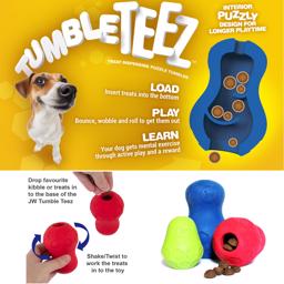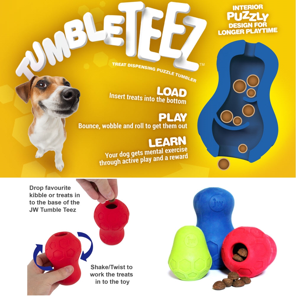 Tumble Teez är tillverkad i giftfri gummi och är en godisdispenser. Designad för torrfoder, våtfoder och godis.