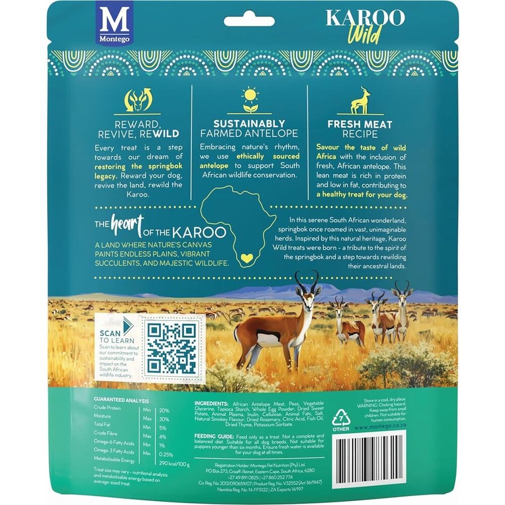 Karoo Wild hundgodis är gjort av antilopkött från Afrika. Ett godis som har ett lågt fettinnehåll och ett högt proteininnehåll samt en karakteristisk viltsmak, som är oemotståndlig för hundar.