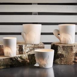 Vit porslinsmugg Kan användas både som mugg och ljusstake. Ljuset kommer att lysa igenom djurmotivet, eftersom detta är utskuret i muggen.