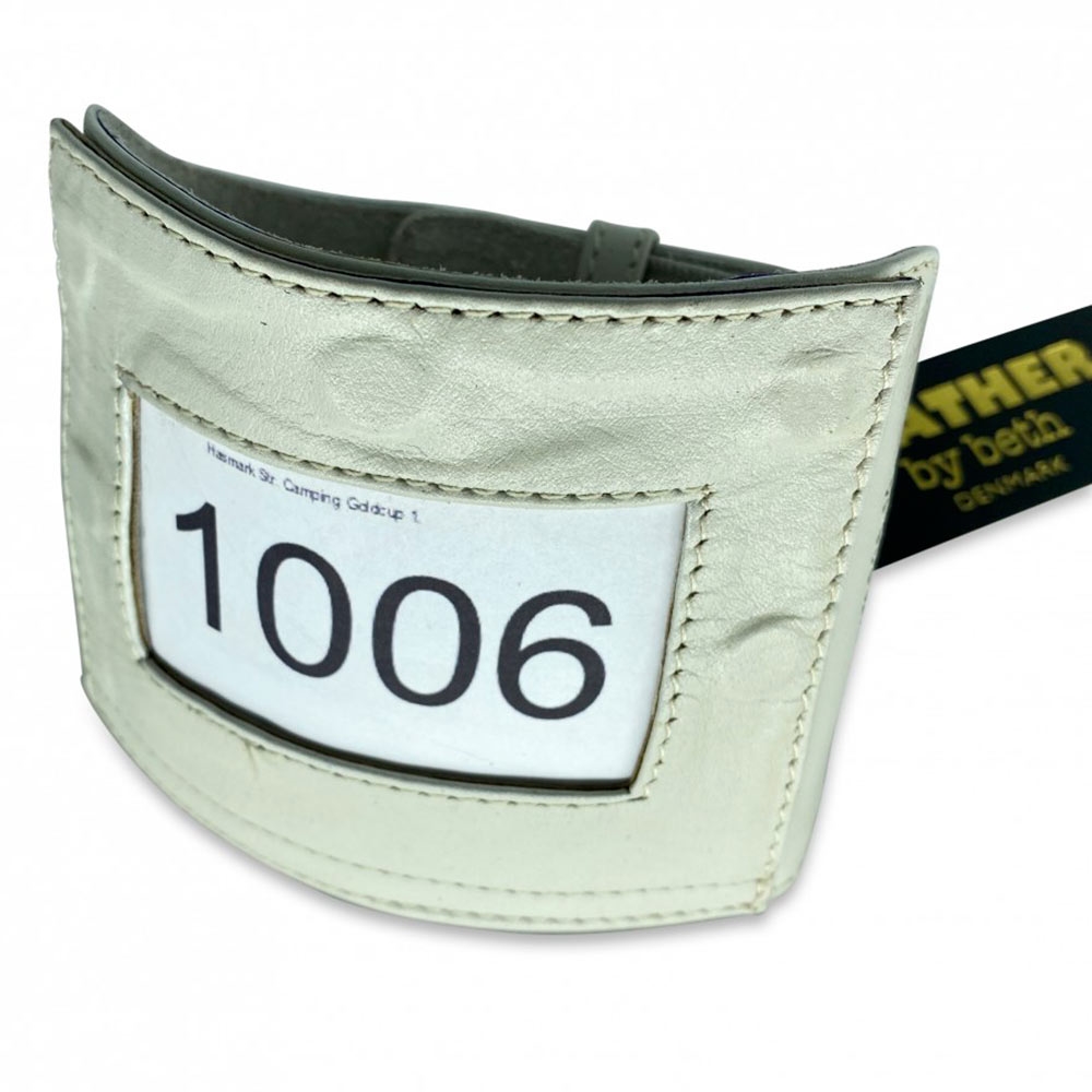 En nummerhållare för armen som kan användas vid hundutställning, ridning, shower eller annat. Denna modell är i off-white läder.