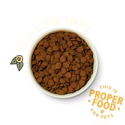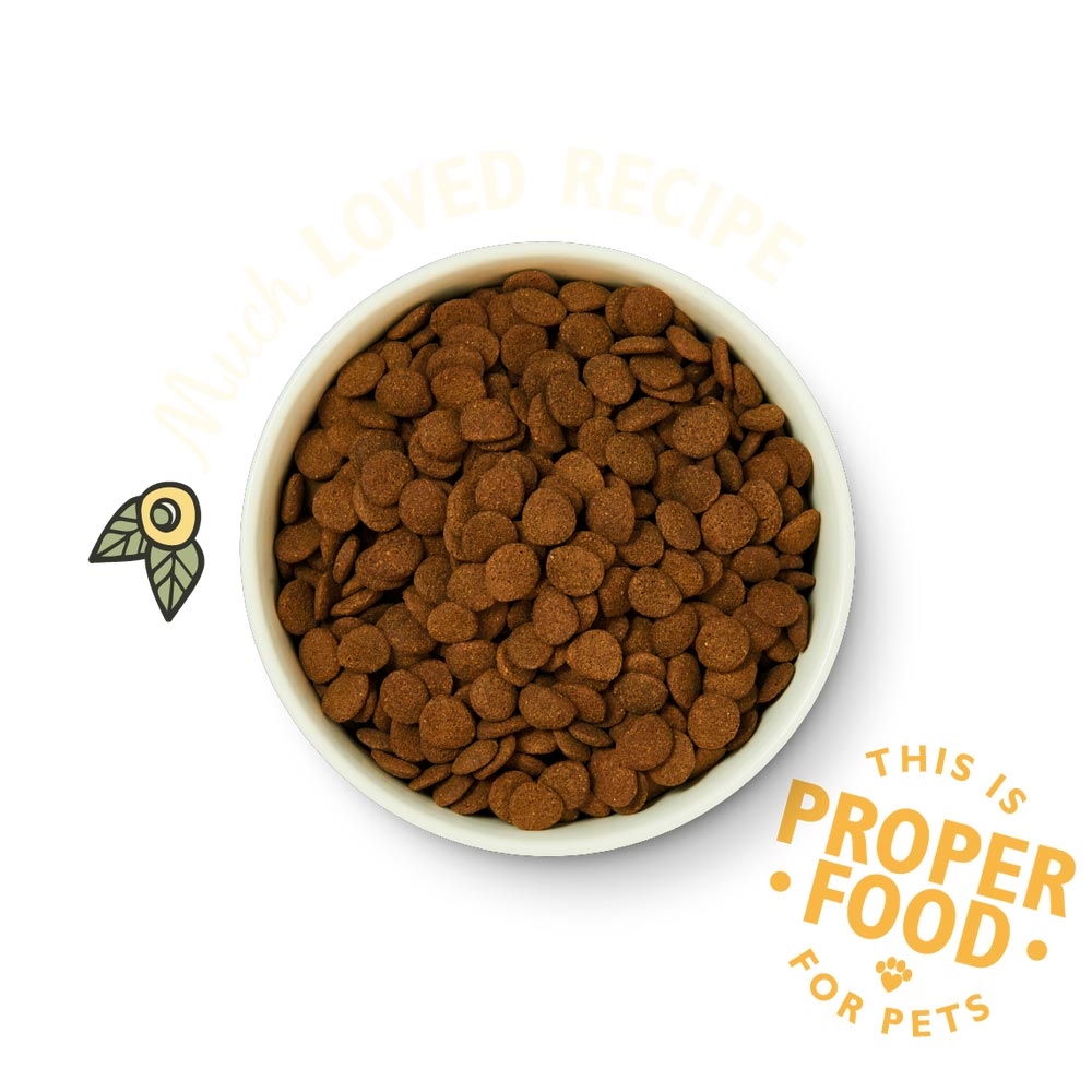 Tillverkat i England.Sammansättning: 42% färskt tillagat: kyckling 31%, anka 8%, kycklinglever 3%. Sötpotatis, ärtor, linser, ärtprotein, linfrö, ägg, kycklingsky, kalciumkarbonat, laxolja, fruktooligosackarider 2,5 g / kg, mannan-oligosackarider 2,5 g / kg, äpplen, vitaminer & mineraler, morötter, spenat, tranbär, glukosamin 175 mg / kg, metylsulfonylmetan 175 mg / kg, kondroitinsulfat 125 mg / kg.