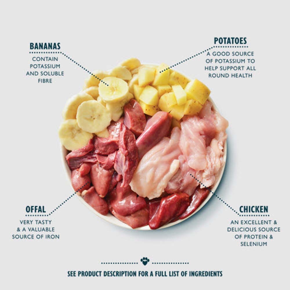 50 % färsk kyckling, potatis (11 %), bananer (9 %), vitaminer och kelaterade mineraler, prebiotisk FOS och MOS.