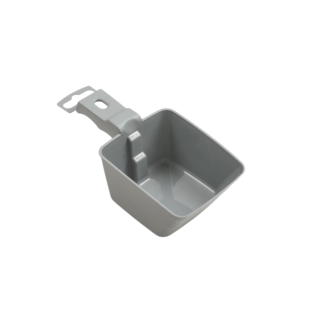 Den integrerade foderskopan gör det enkelt att dosera fodret direkt från containern, utan spill och utan att behöva leta efter extra redskap.