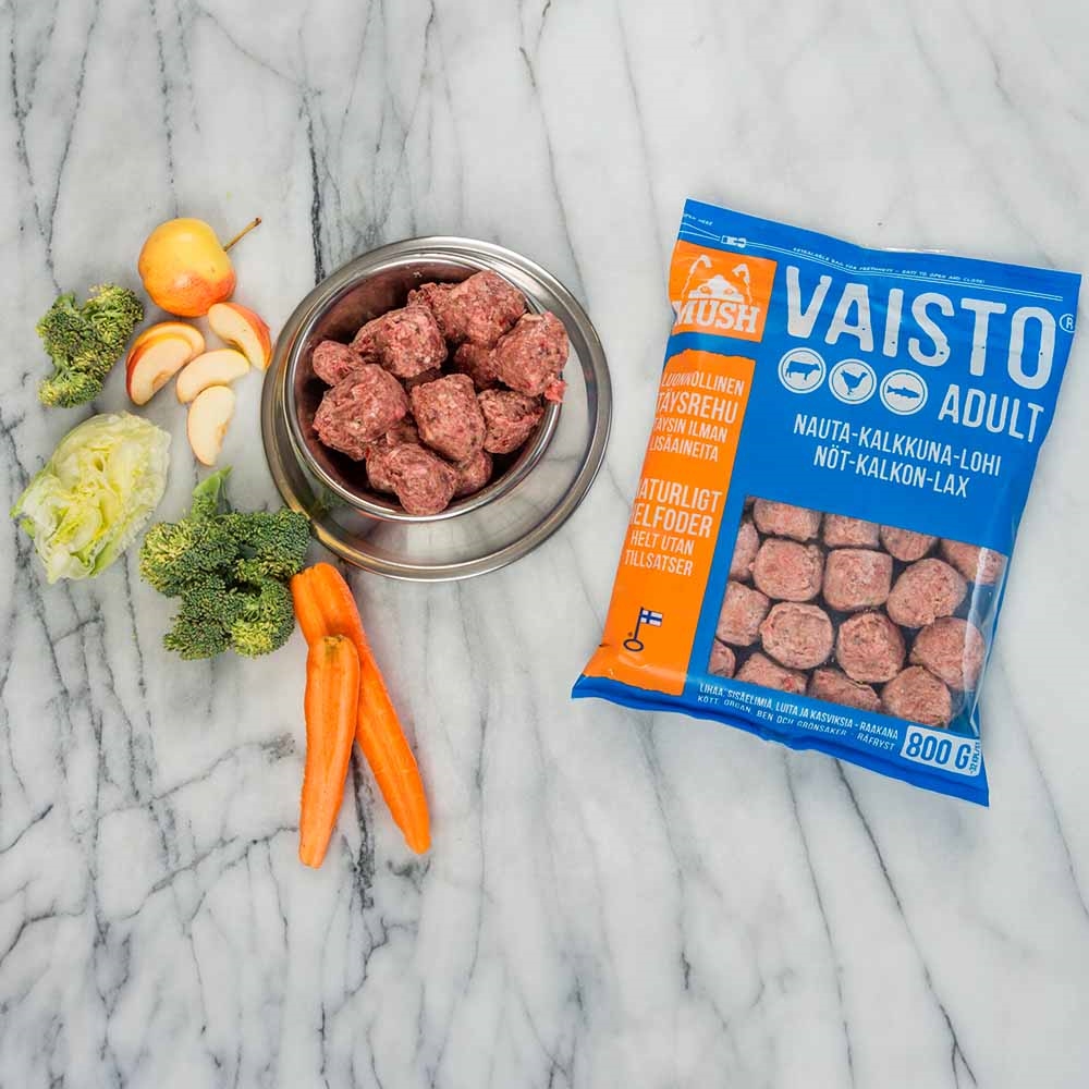 Vaisto® erbjuder helt spannmålsfri och tillsatsfri näring, som stärker muskler, skelett och främjar ett gott allmänt välbefinnande. Dessutom är MUSH Vaisto lätt att dosera.