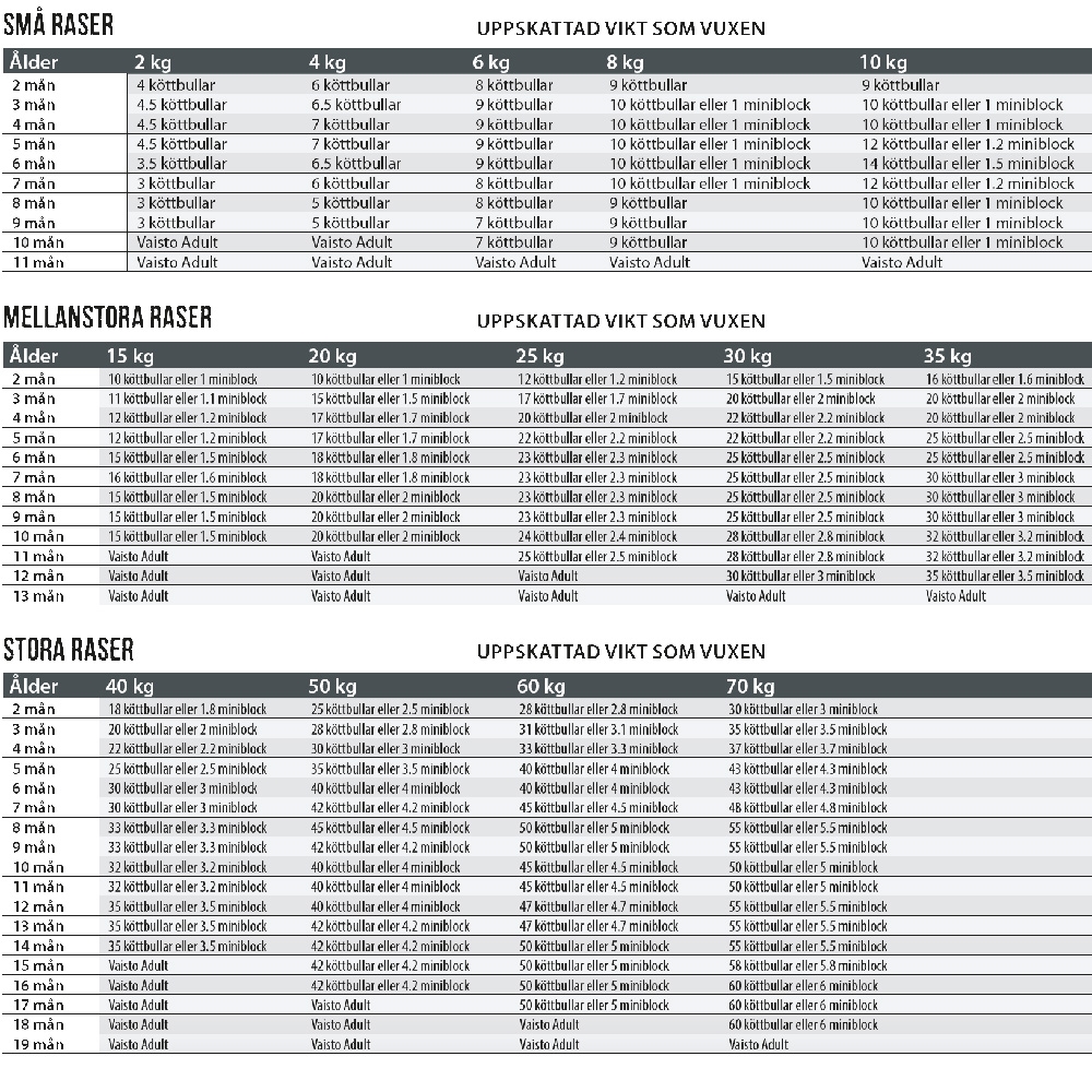 I översikten - som du hittar under bilderna - har vi noterat den genomsnittliga fodermängden för valpar av olika åldrar och raser. Kom ihåg att detta endast är en vägledande mängd, och din valps specifika behov kan avvika från tabellen.