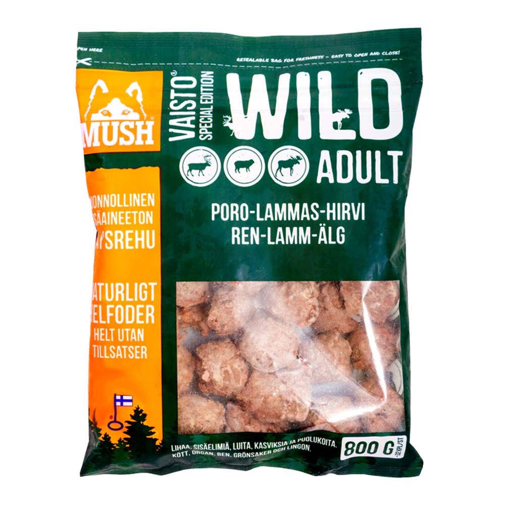 Denna variant här är Vaisto Wild som är en banbrytande produkt, som produceras uteslutande av de renaste råvaror som kan fås. De fritt betande djuren är inte bara ett etiskt val, utan också ett hälsosamt val på grund av deras goda näringsvärden. Detta är förstavalet för hundar med allergier! Wild innehåller också lingon!