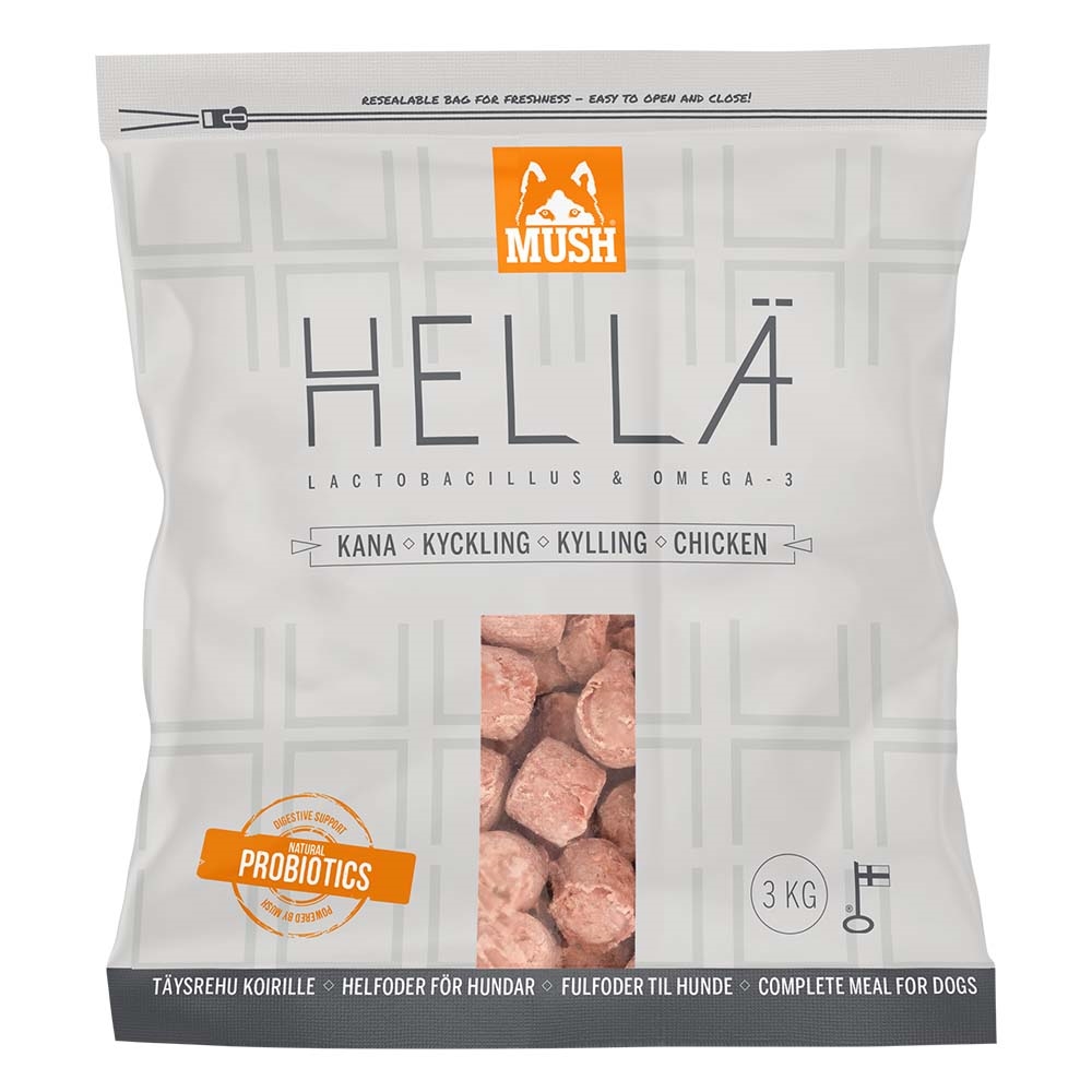 Hellä Kyckling är ett fettsnålt, funktionellt superlivsmedel och ett helfoder. De fermenterade grönsakerna innehåller en brokig skara mjölksyrabakterier, som är viktiga för att tarmkanalen ska må bra, och kvalitetsblandningen av omega-3-fiskolja och olivolja stödjer hundens kognitiva funktioner och bidrar till att pälsen, huden och hjärtat ska må bra.