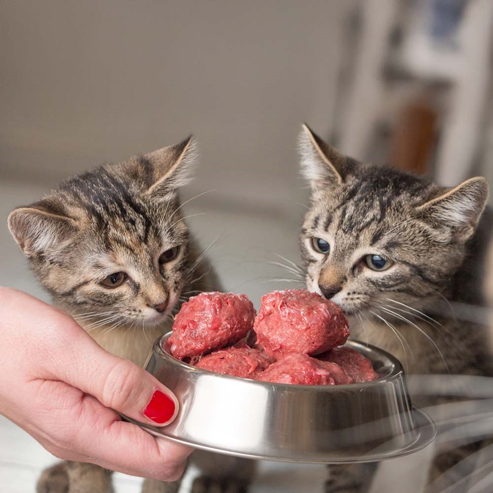 Dela upp maten på 2–3 måltider för en vuxen katt, och förvara oäten mat i kylskåpet. Kattungar och dräktiga/digivande katter bör äta oftare, 4–6 gånger per dag.
