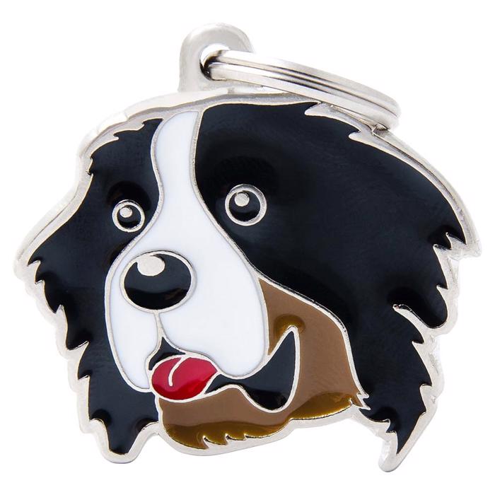 Här får du en kvalitets hundbricka i metall från MyFamily, som är designad som rasen Berner Sennen.