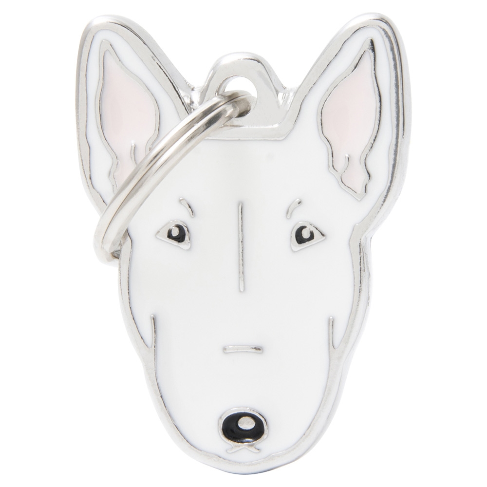 Här får du en kvalitets hundbricka i metall från MyFamily, designad som en bullterrier.