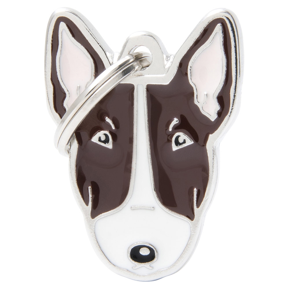 Här får du en kvalitets hundbricka i metall från MyFamily, designad som en bullterrier.