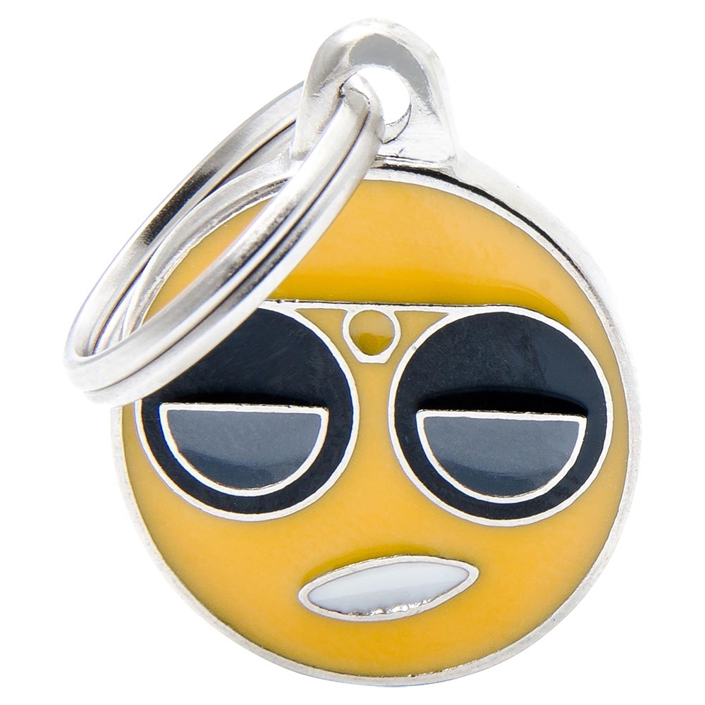 Hundbricka med en rolig emoji som ser cool ut. Brickan inkluderar gravering.