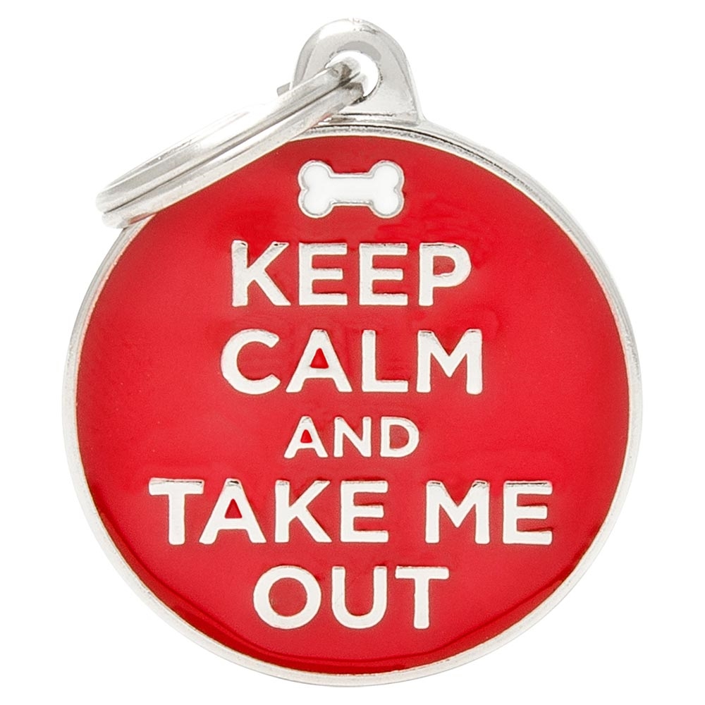 Hundbricka till hunden med texten "Keep calm and take me out". Brickan inkluderar gravering.