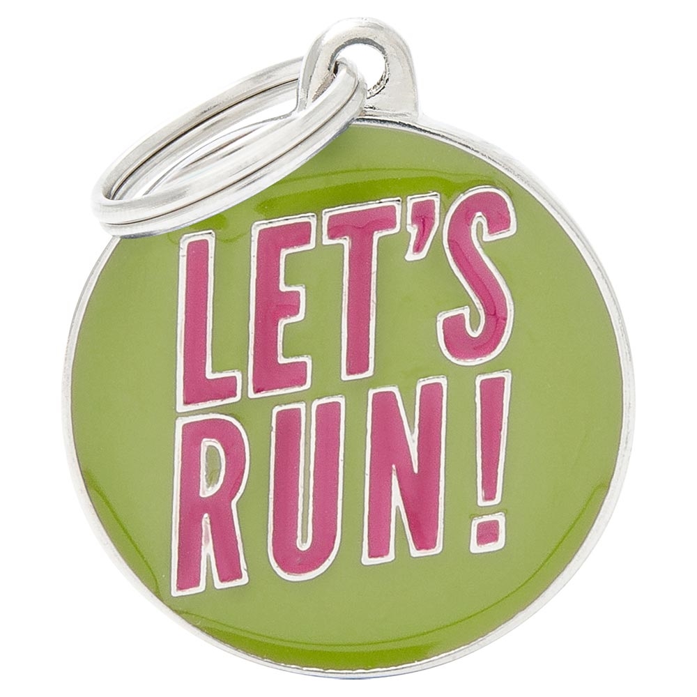Här får du en kvalitets hundbricka i metall från MyFamily, som är designad som en grön cirkel med texten "Let's Run!". Hundbrickan graveras direkt hos oss när du beställer. Så denna bricka inkluderar ditt val av gravering. Det följer med en liten nyckelring till brickan.