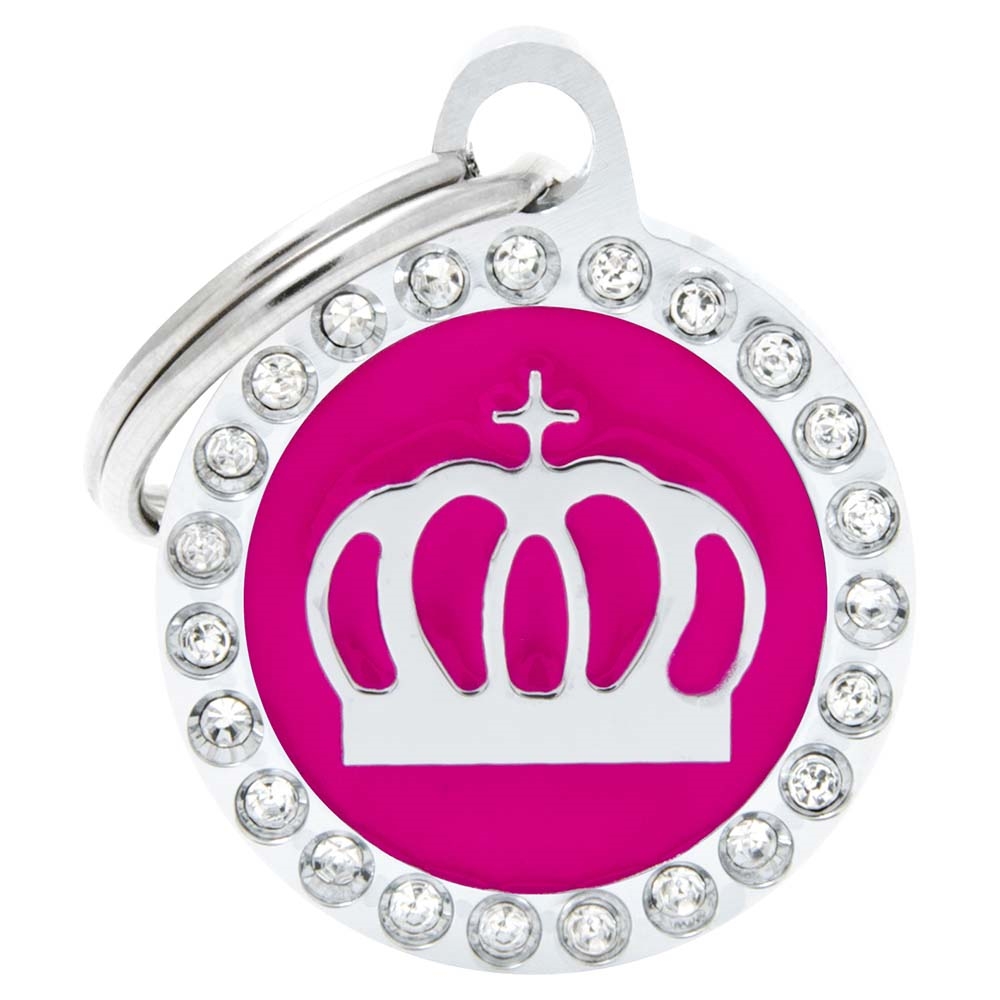 My Family Hundbricka - En liten cirkel i rosa och silver, med kungakrona och stenar.