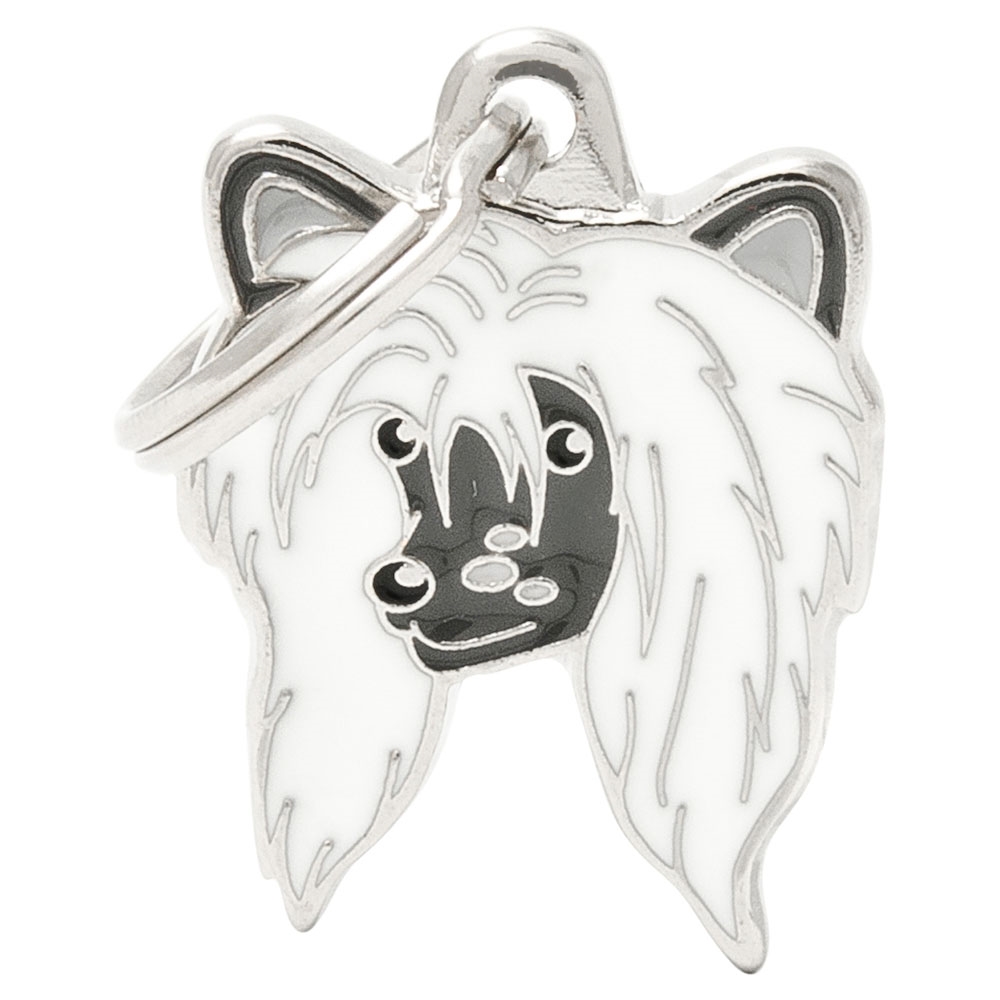 Här får du en kvalitets hundbricka i metall från MyFamily, som är designad som rasen chinese crested.