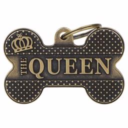 Hundbricka i aluminium formad som ett köttben. Denna hundbricka har texten "The Queen".