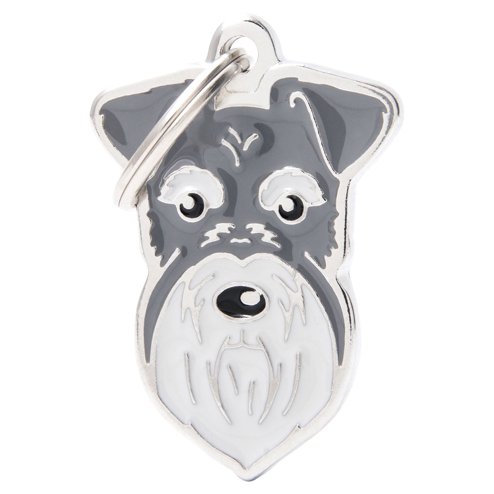 Här får du en kvalitets hundbricka i metall från MyFamily, som är designad som rashunden schnauzer.