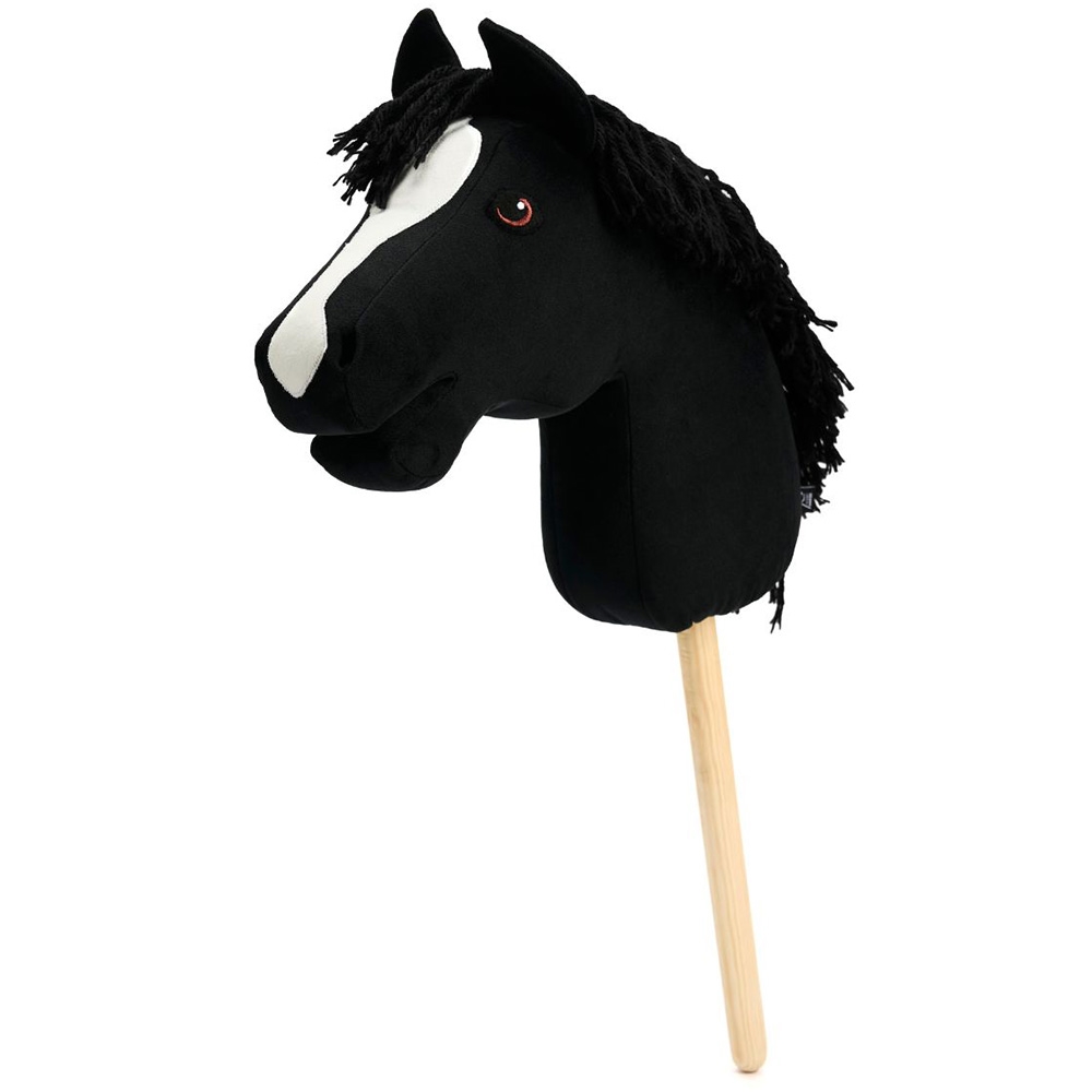 Elegant svart käpphäst med mjuk man och träpinne - redo för vilda ridturer och fantasifulla äventyr.