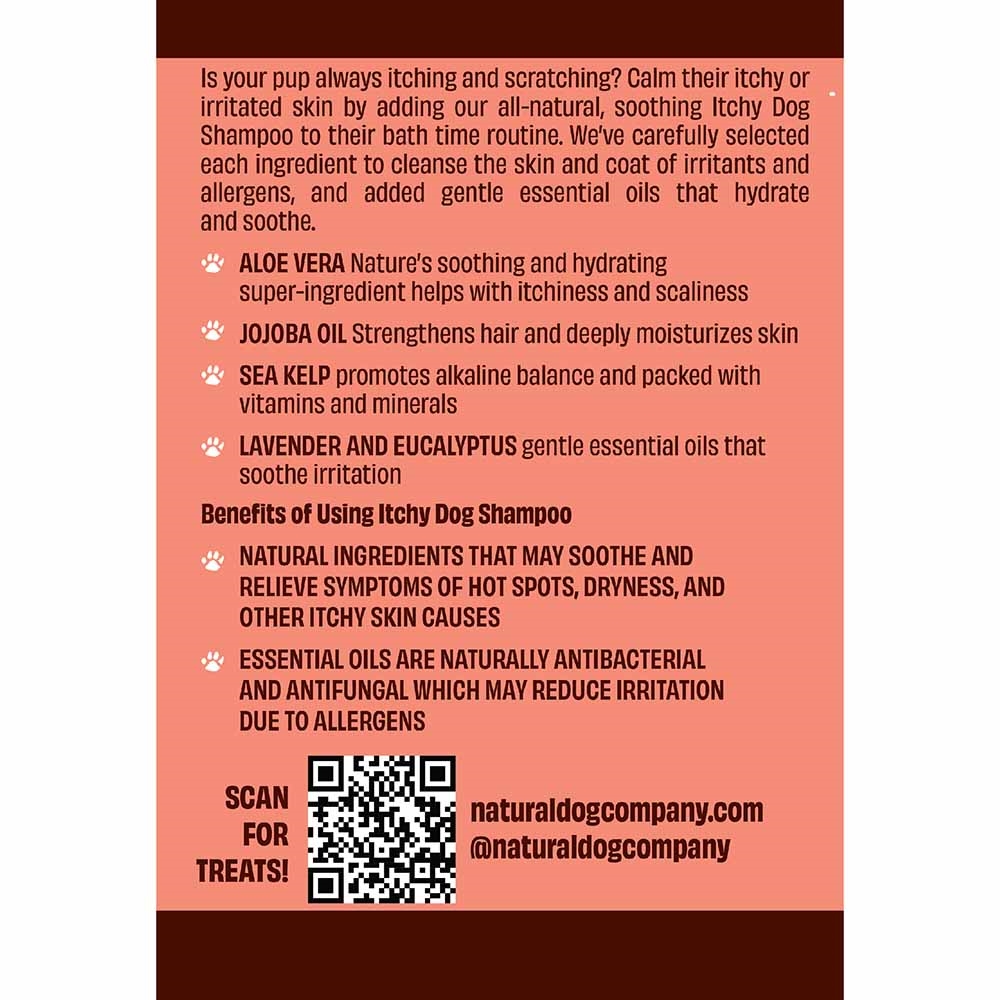 Natural Dog Company Itchy schampo är otroligt bra för återkommande hudirritationer. Med detta schampo kan du behandla din hund löpande om den har tendens till hudproblem. Det kan vara olika hudutmaningar, insektsbett, hotspots eller rodnad. Detta schampo har en otroligt neutral formula, som är perfekt för att tvätta bort irriterande ytor, samtidigt som det ger en lugnande lindring till den kliande och irriterade huden.