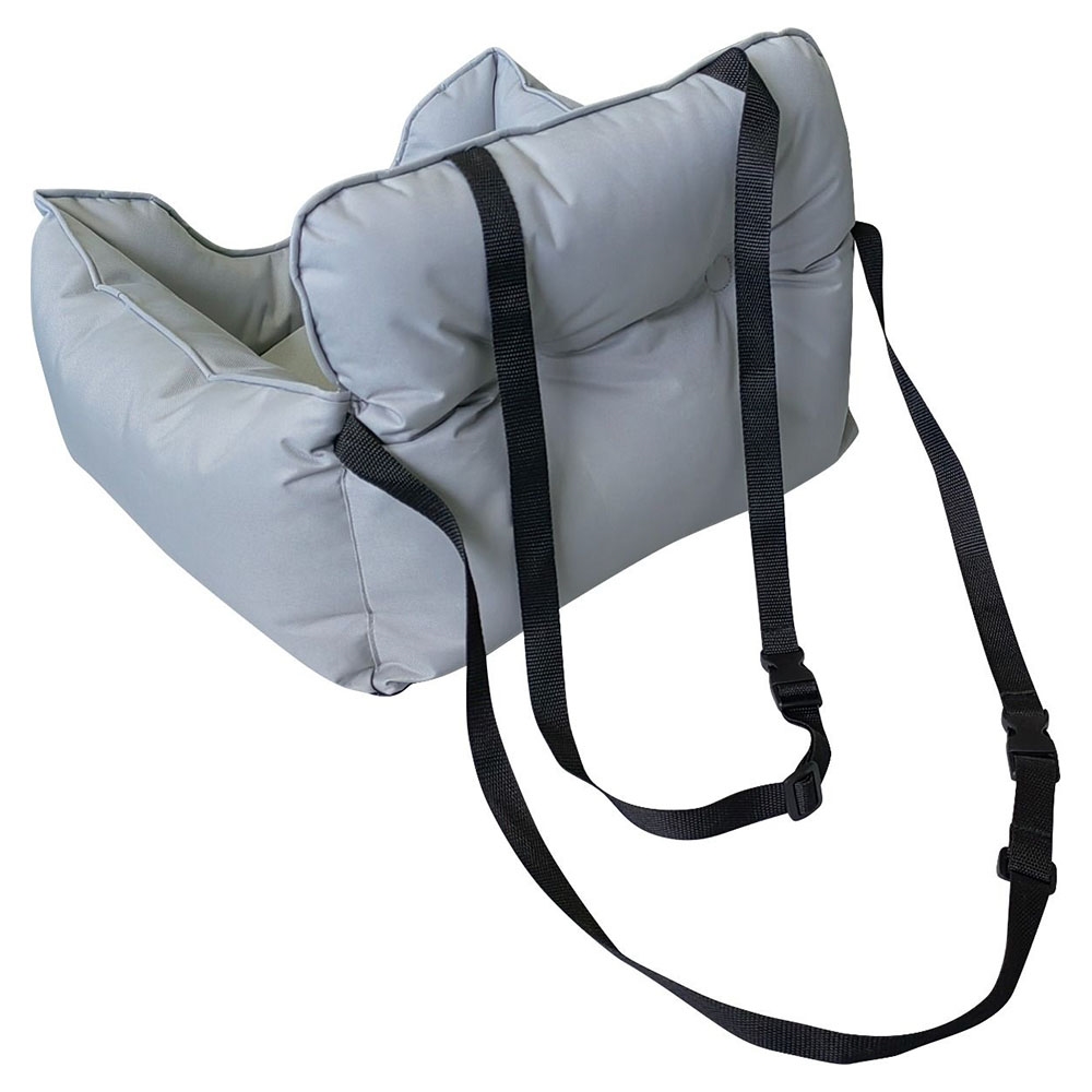 Som du kan se på bilden är den härligt puffig och de höga sidorna används också för att lägga det lilla hundhuvudet på. Bilbarnstolen kan enkelt placeras på framsätet eller baksätet i bilen. Det finns en liten rem med karbinhake inuti så att du kan säkra hunden i selen.