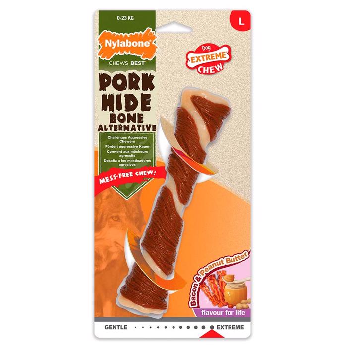 Nylabone Extreme Pork Hide Bone är designad för att utmana även de mest aggressiva tuggare. Det otroligt hållbara nylonet sysselsätter och tillfredsställer hundens naturliga behov av att bita och tugga och hjälper till att bygga upp sunda tuggvanor.