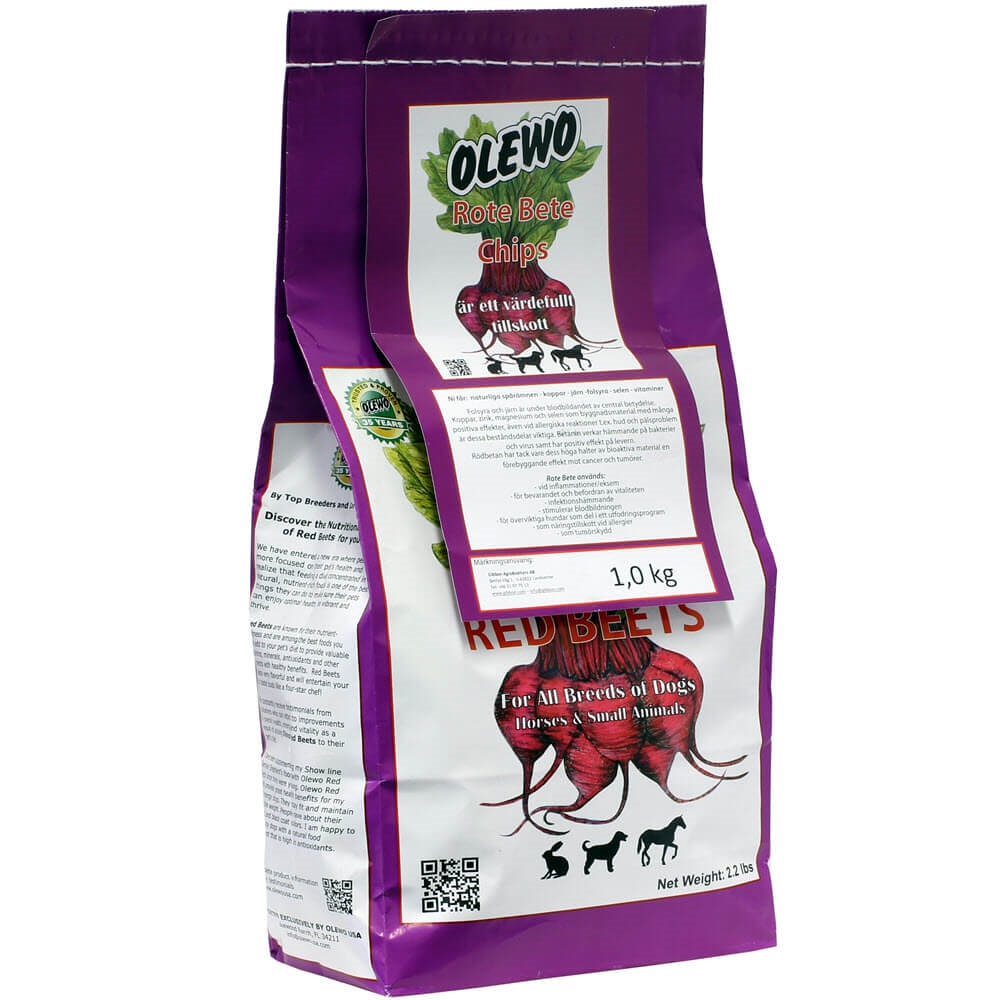I över 40 år har Olewo tillverkat kosttillskott för hundar. Endast tillskott som är naturliga och deras företag ligger tryggt i det vackra Tyskland. Där man sätter en ära i att vara ordentlig. Rödbetschips är bra för matsmältningen, de tas upp otroligt snabbt och är helt naturliga. Det finns inget GMO, inga tillsatser, inga konstgjorda färgämnen och inget annat än den rena naturliga rödbetan som varsamt skurits och torkats.