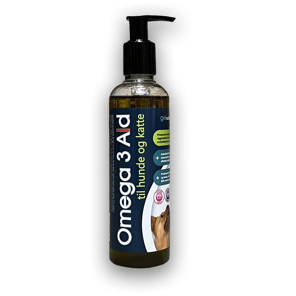 Det finns många goda skäl att ge din hund en bra olja. Omega 3 Aid för hundar är en 100 % vegetabilisk olja med ett rikt innehåll av Omega 3 och naturligt vitamin E som antioxidant.