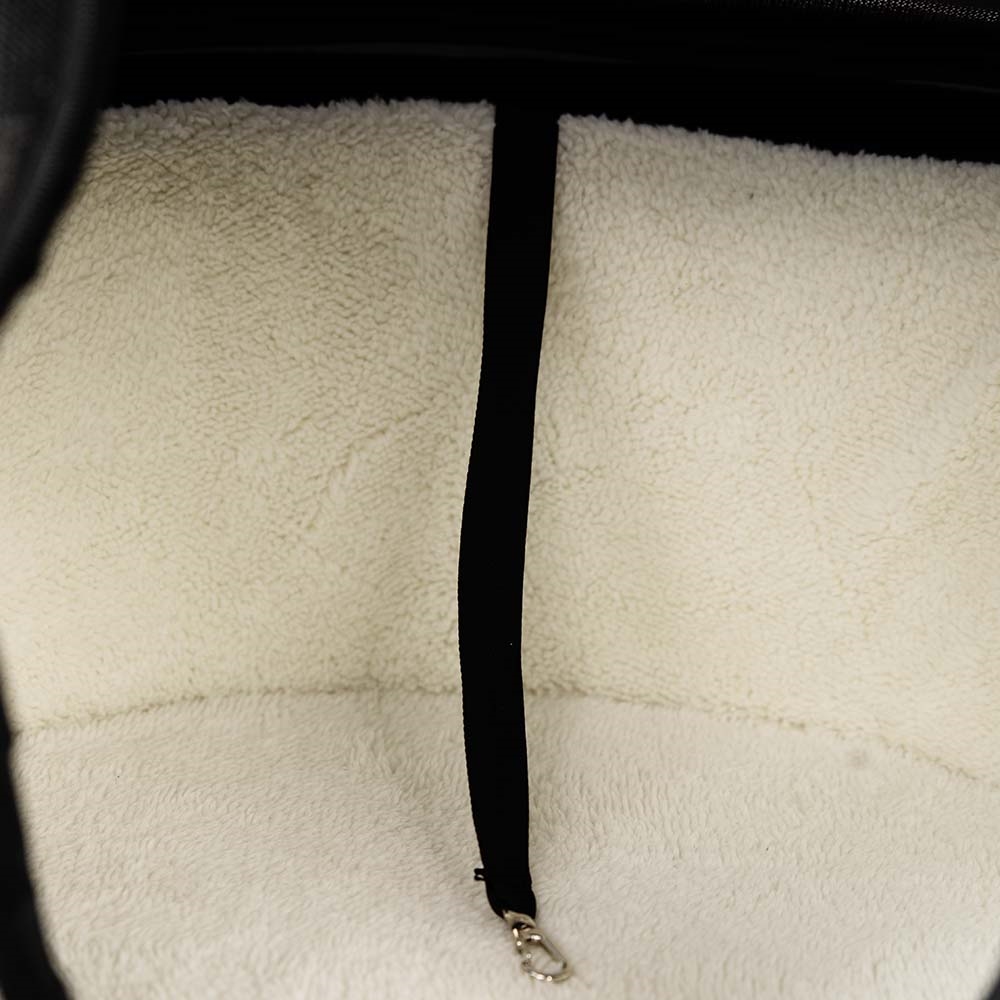 I väskan finns en säkerhetslina som du kan fästa i din hunds eller katts sele. Så är du säker på att den inte hoppar ut ur väskan när du öppnar den.