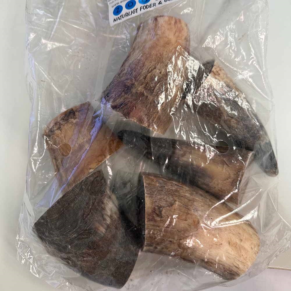 Hornen kommer i blandade storlekar, som tillsammans utgör 1000 gram. Några av hornbitarna är spetsiga, andra är mellanstycken från hornet. Se på våra bilder hur en påse KAN se ut.
