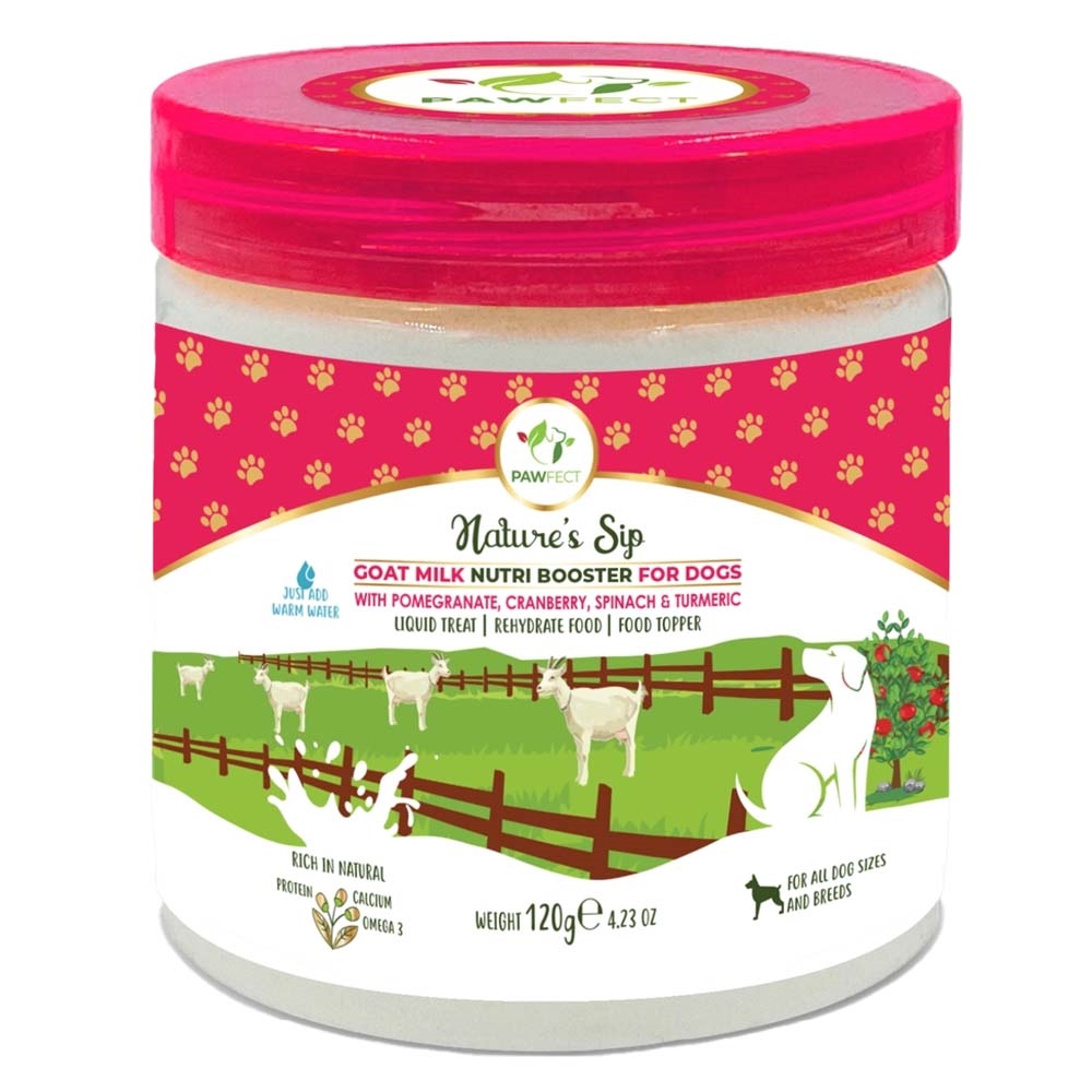 Denna getmjölk från Pawfect är ett 100% naturligt kosttillskott för hundar, berikat med granatäpple, tranbär, spenat och gurkmeja. Pulvret är lättlösligt i vatten och kan användas på flera sätt - antingen som en läcker dryck, hällt över fodret för att göra det mer vått, eller strött direkt över maten.