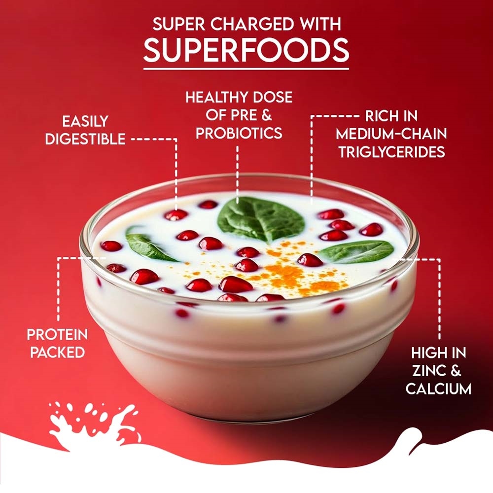 100% naturliga ingredienser: getmjölk, granatäpple, tranbär, spenat & gurkmeja