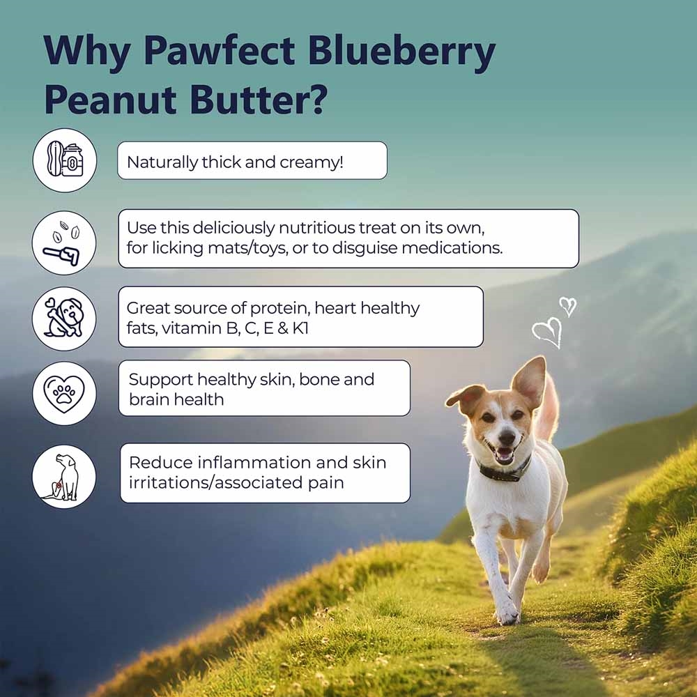 Jordnötssmör för hundarPawfect peanut butterJordnötssmör med blåbärNaturliga godbitar för hundSpannmålsfria godbitar för hundJordnötssmör för hundar