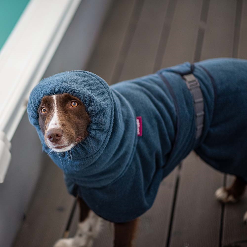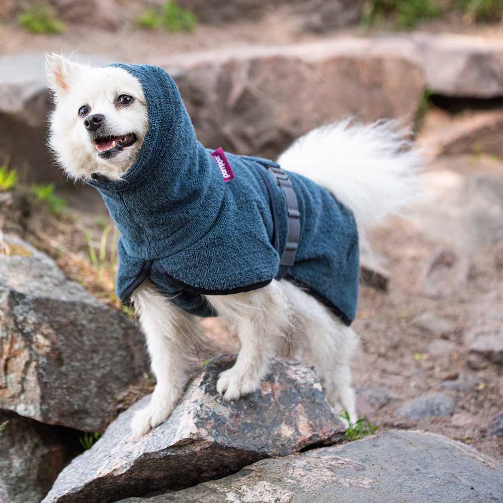 BathPomppa är en mycket absorberande badrock som hjälper din hund att torka snabbare efter simning, bad eller regniga äventyr. Den stora huvan, det andningsbara bomullstyget och den obehindrade designen säkerställer maximal torkeffektivitet och komfort för din hund.