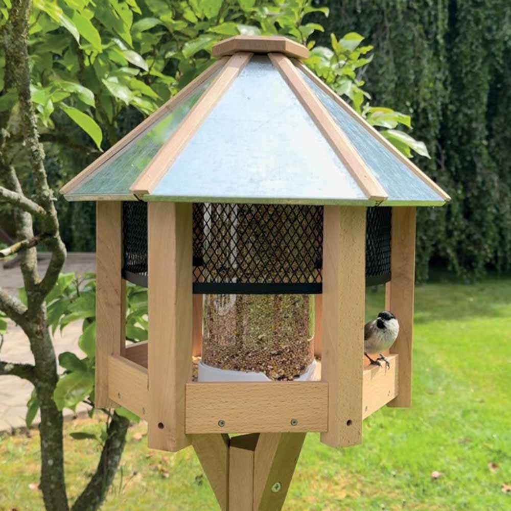 • Huset inkluderar ett övre galler som skyddar mot att större fåglar tar över matplatsen.