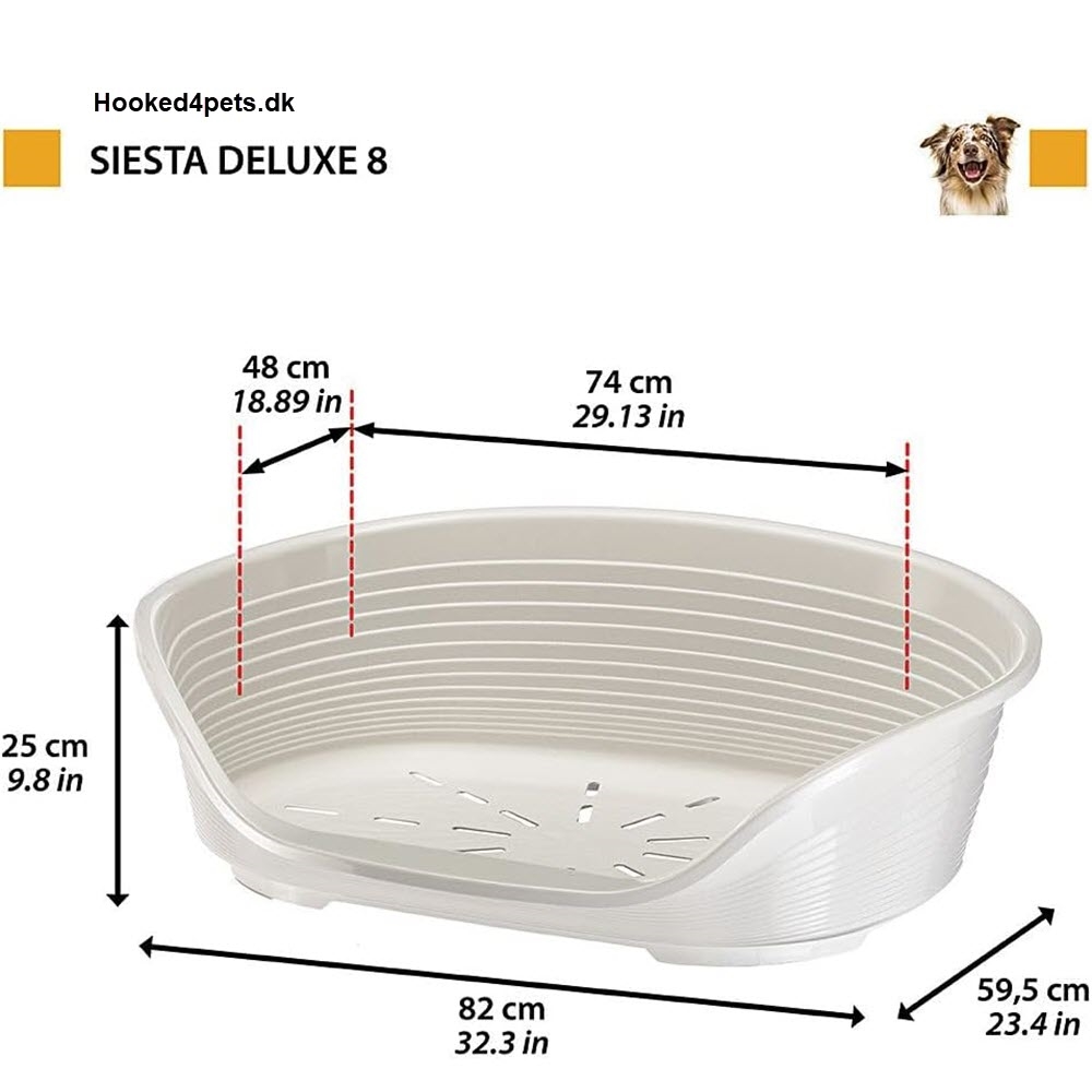Denna bädd kan stå ute i alla väder utan att bli skadad. Dock bör det nämnas att om den konstant står i solen kan den blekas i färgen. Bädden är lätt att rengöra och har ventilationshål i botten för extra komfort. Den har en rundad form, med höga sidor och en låg framsida med en bekväm öppning, så din hund kan ligga och slappna av med hakan på kanten. Bädden är halkfri och har stödjande fötter under.