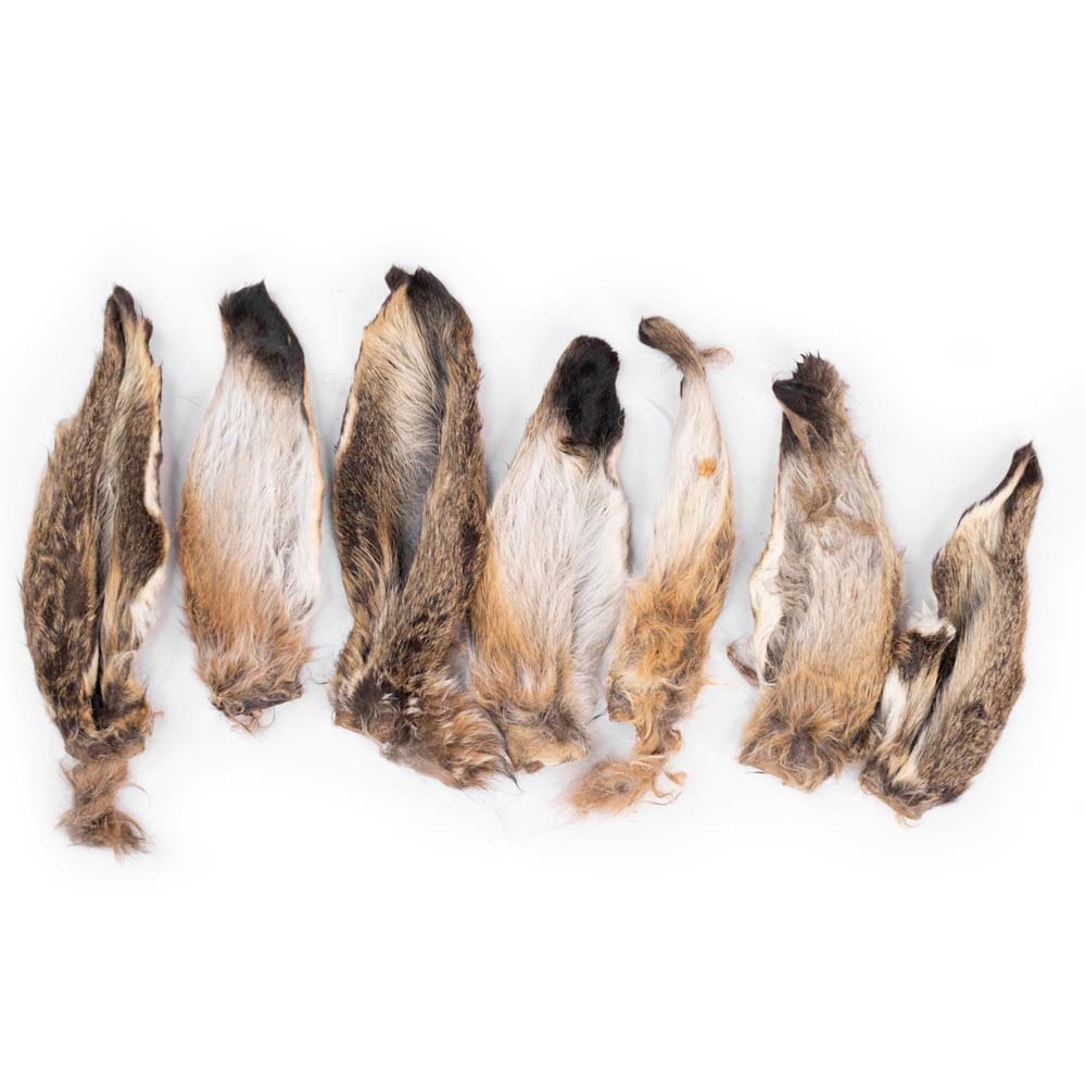 Naturligt torkade kaninöron med päls från vilda kaniner.