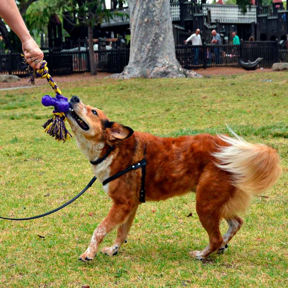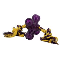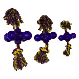 Leksaken består av ett gult och lila färgat rep, där det mellan knutarna sitter ett mjukt gummikors, som har hål, så man kan fylla godis i den. Starmark har själva gjort några läckra godbitar som kan användas till, dem kan du hitta här.