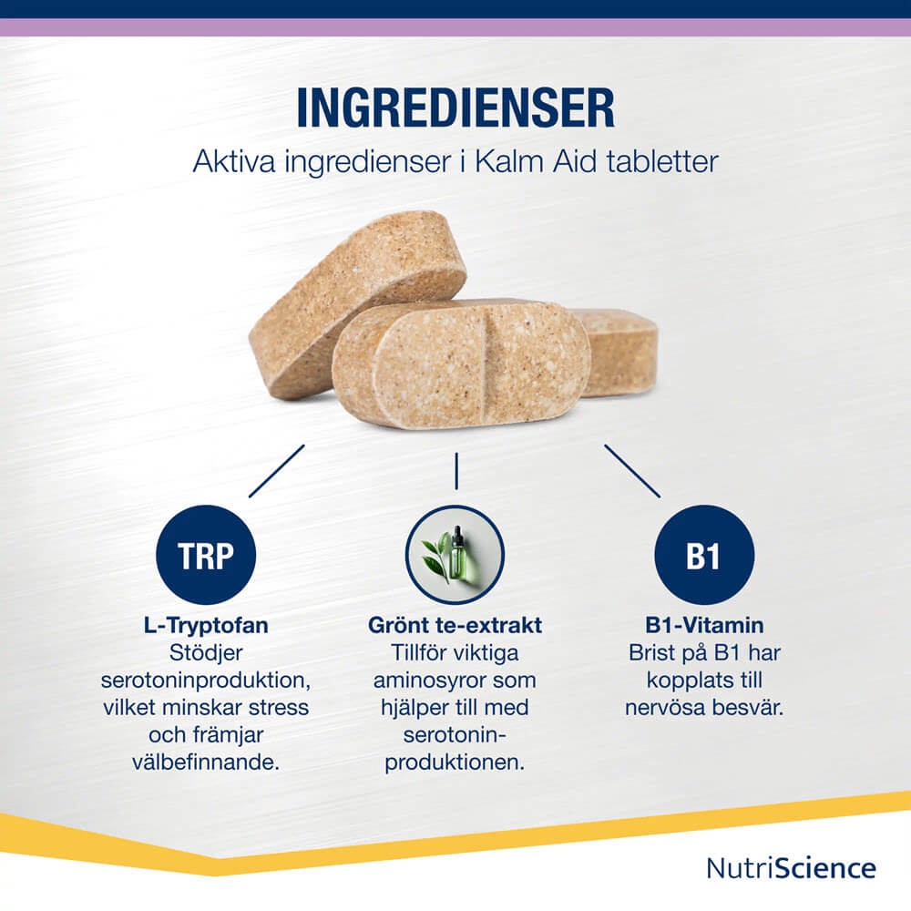 Kalmaid innehåller L-tryptofan och extrakt av grönt te. Grönt te är en källa till L-theanin och ger i kombination med L-tryptofan de essentiella aminosyror som hjälper till att stimulera produktionen av serotonin. Serotonin spelar en viktig roll i att upprätthålla lugn och avslappning hos djur. KalmAid innehåller dessutom tiamin (vitamin B1), som vid brist har varit kopplat till nervösa störningar.