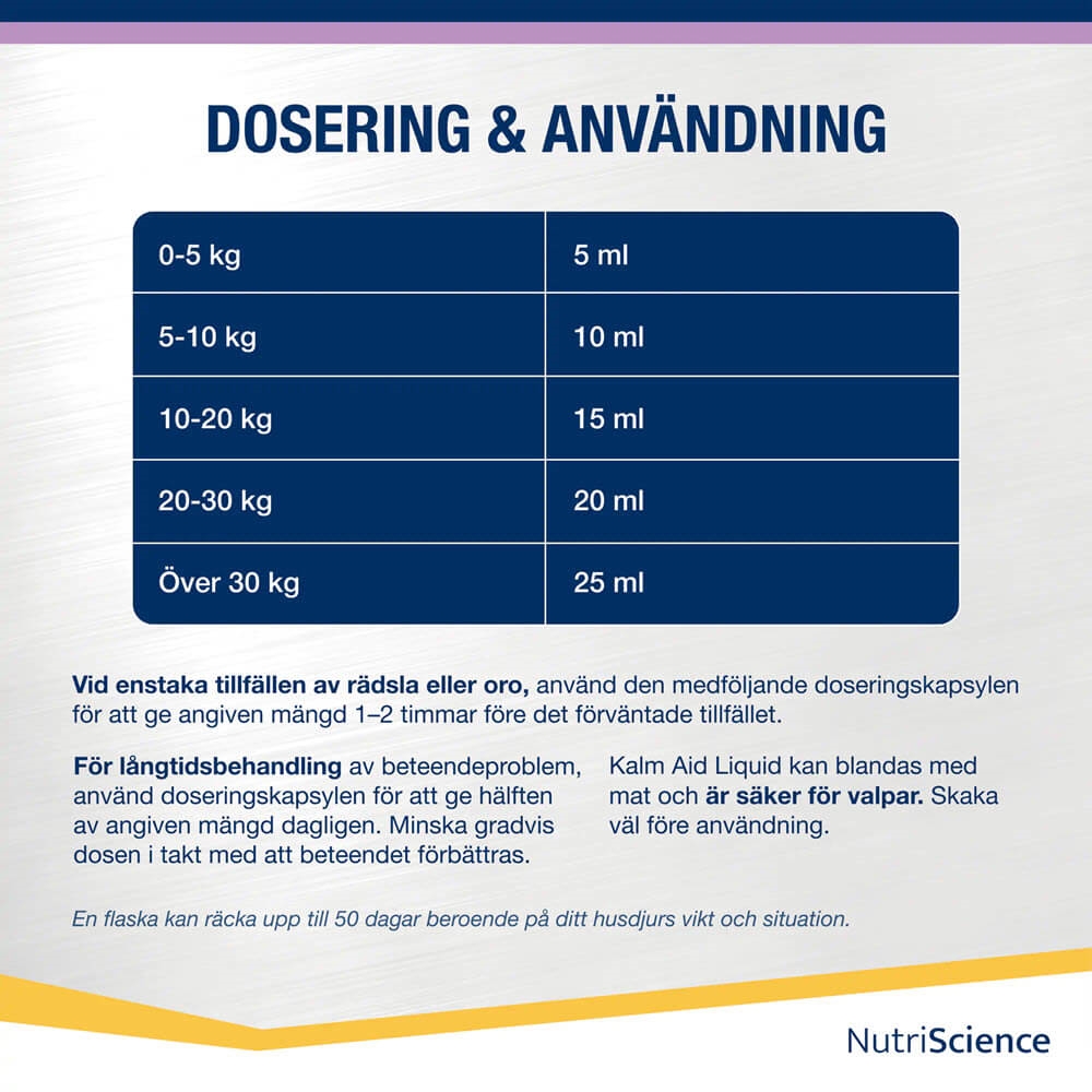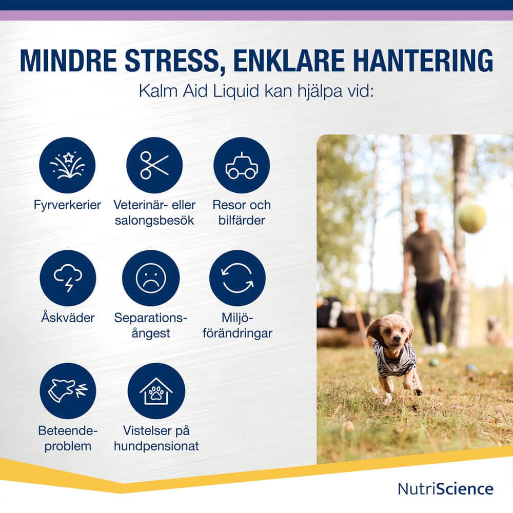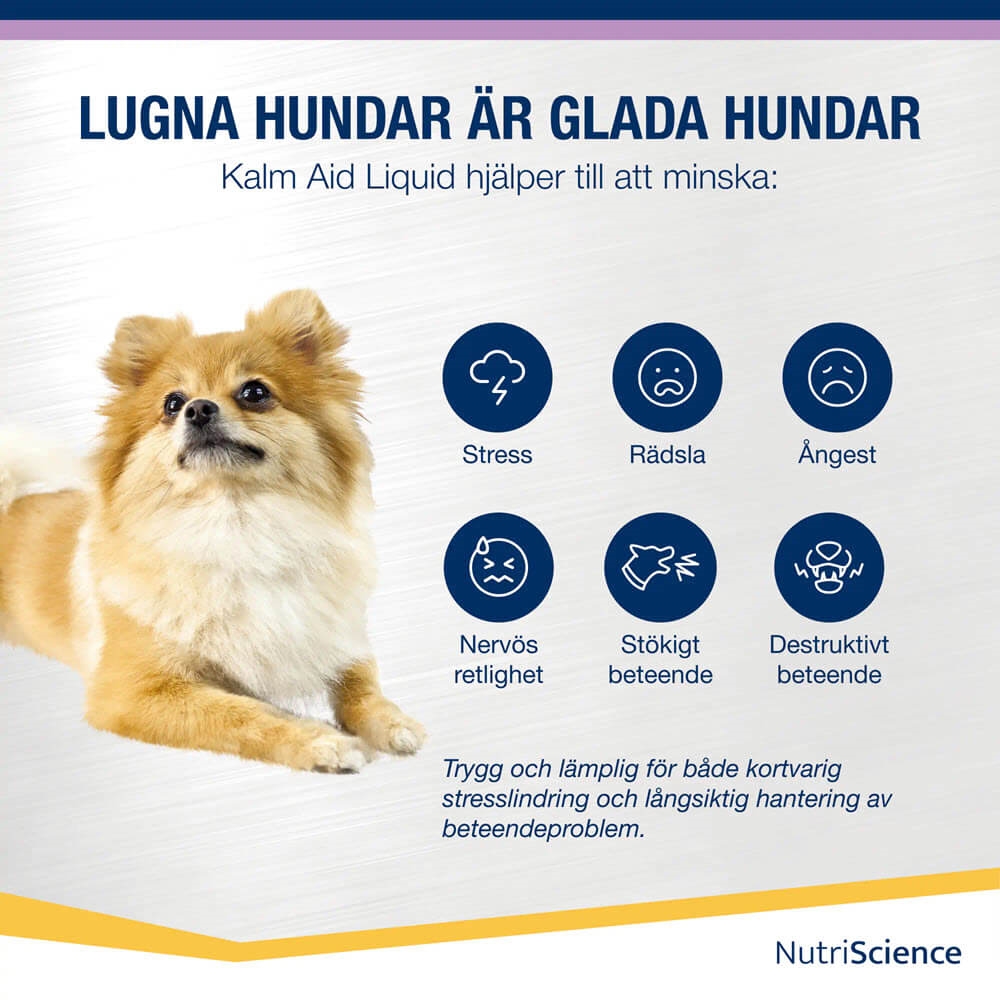 KalmAid är ett L-tryptofanbaserat fodertillskott som hjälper till att lugna mindre djur under perioder av stress och ångest. Stress och ångest hos hundar kan till exempel uppstå när de är separerade, i främmande eller bullriga miljöer och vid närvaro av fyrverkerier.