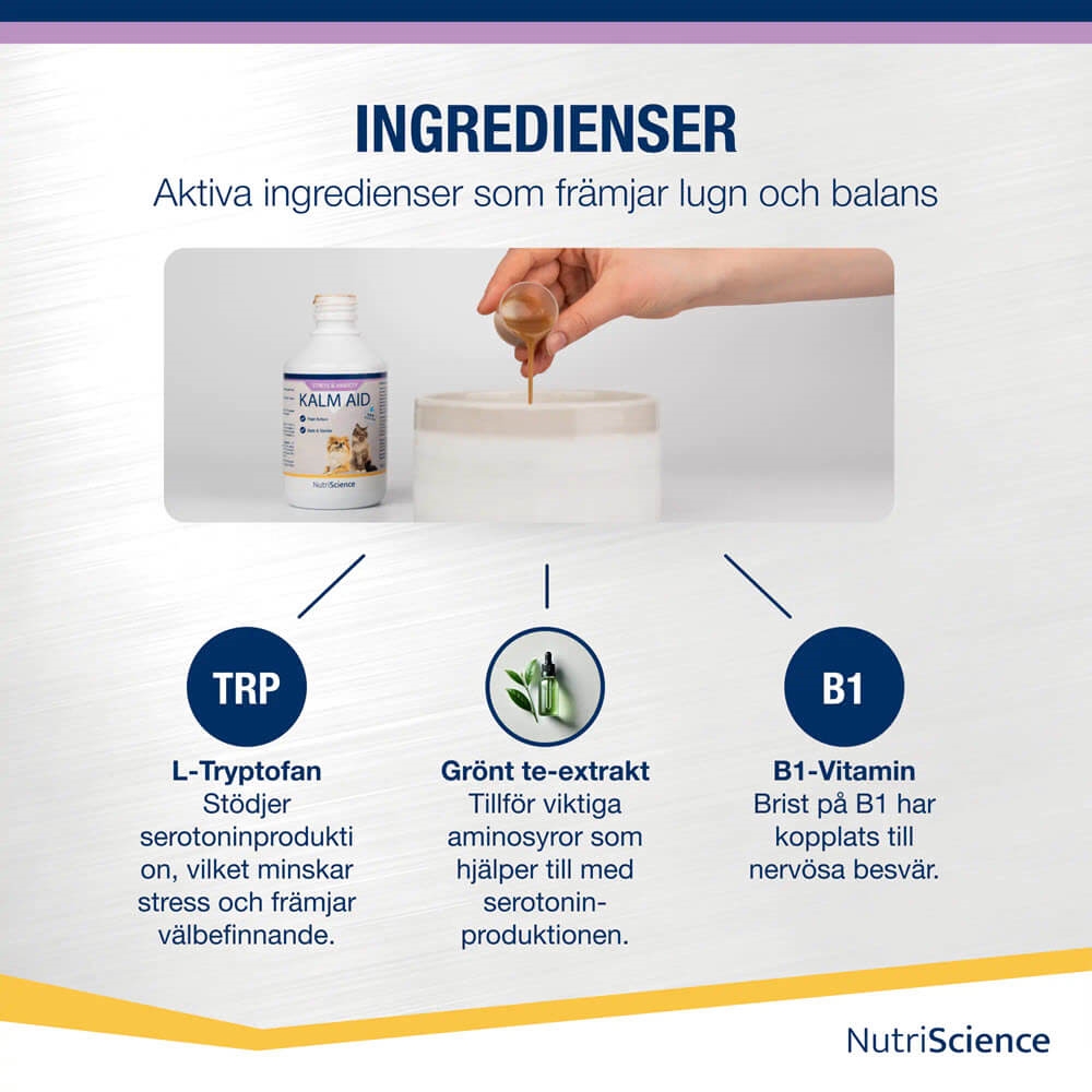 Kalmaid innehåller L-tryptofan och extrakt av grönt te. Grönt te är en källa till L-theanin och ger i kombination med L-tryptofan de essentiella aminosyrorna som hjälper till att stimulera produktionen av serotonin. Serotonin spelar en viktig roll i att upprätthålla lugn och avslappning hos djur. KalmAid innehåller dessutom tiamin (vitamin B1), som vid brist har varit kopplat till nervösa störningar.