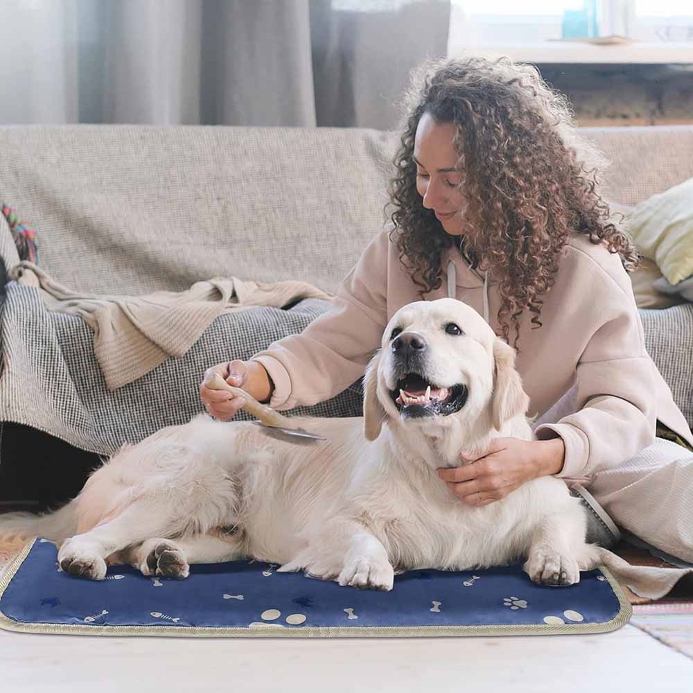 Denna värmedyna har en blå design med små söta tassar, köttben och fiskskelett på. Dynan mäter 70x45 cm och kan användas för hundar och katter. Dynan är tillverkad enligt de högsta säkerhetsstandarderna, är 100% reptålig och lätt att rengöra.