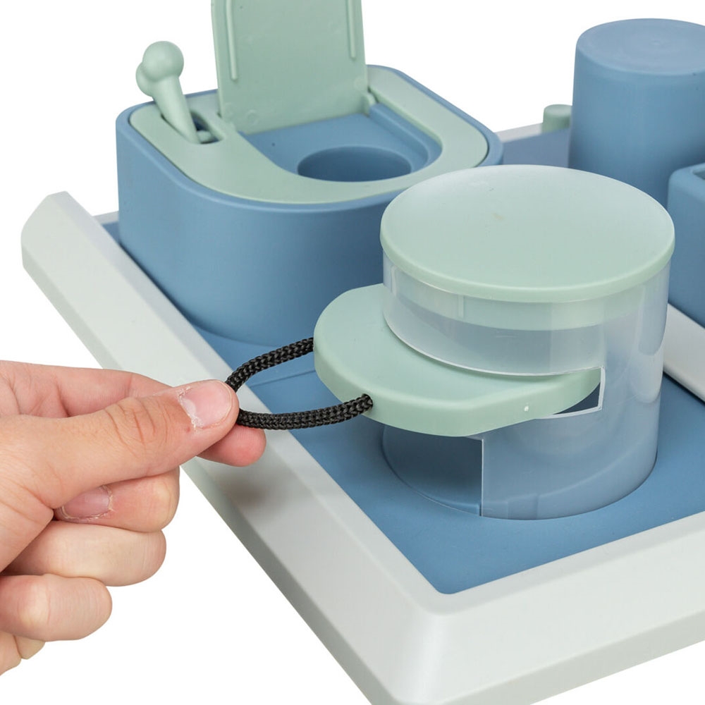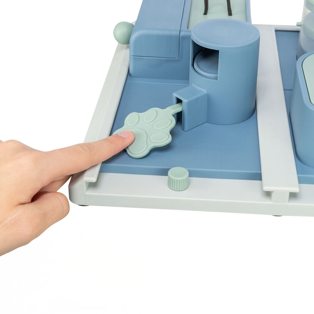 De olika elementen gör att hunden måste hitta flera lösningar för att få tag på godbitarna. I detta spel måste det både tryckas, dras och vridas.