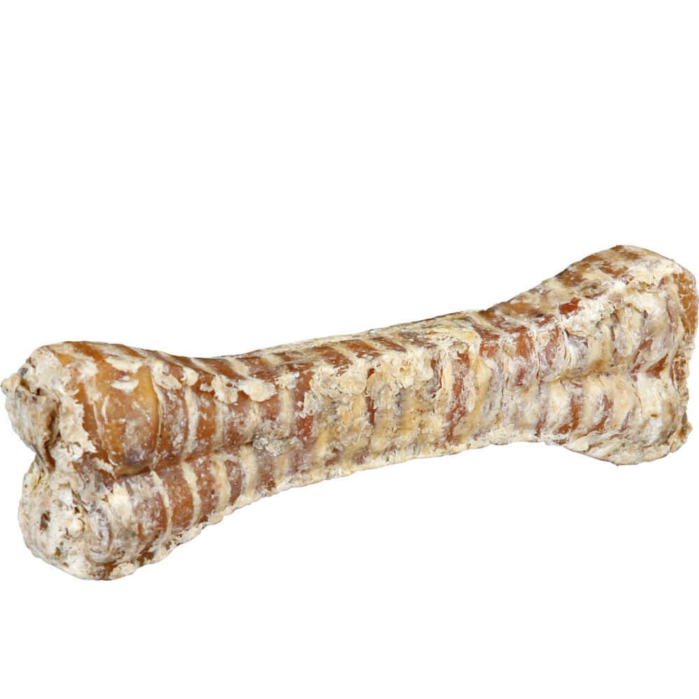 Läckert naturligt ben till hund tillverkat av torkat rått nötskinn med fyllning av torkad luftstrupe från oxe