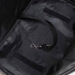 Väskan kan öppnas i toppen med dragkedja och har en utvändig ficka. Invändigt i väskan finns ett kort koppel med en karbinhake, så att du kan fästa hunden i dess hundsele.