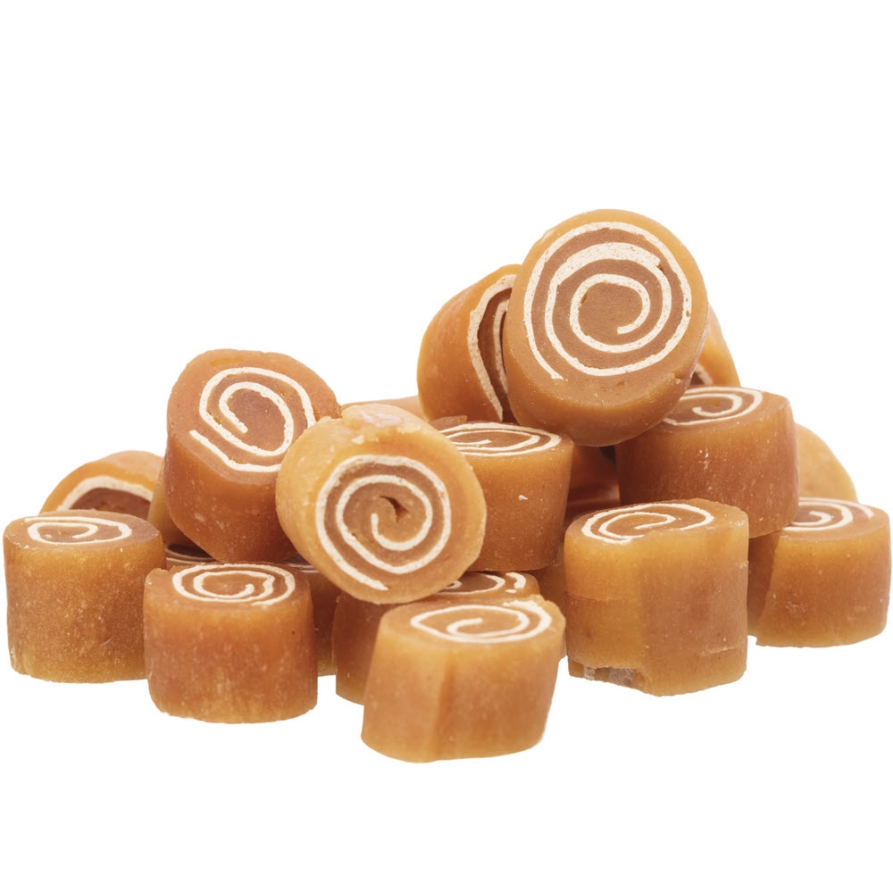 Läckra små rullar av kyckling och fisk. Kan ges till alla typer av hundar. Det finns 75 gram i påsen.