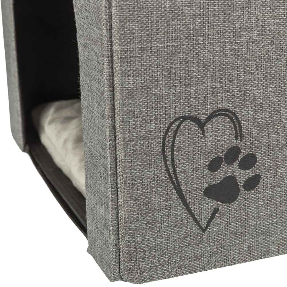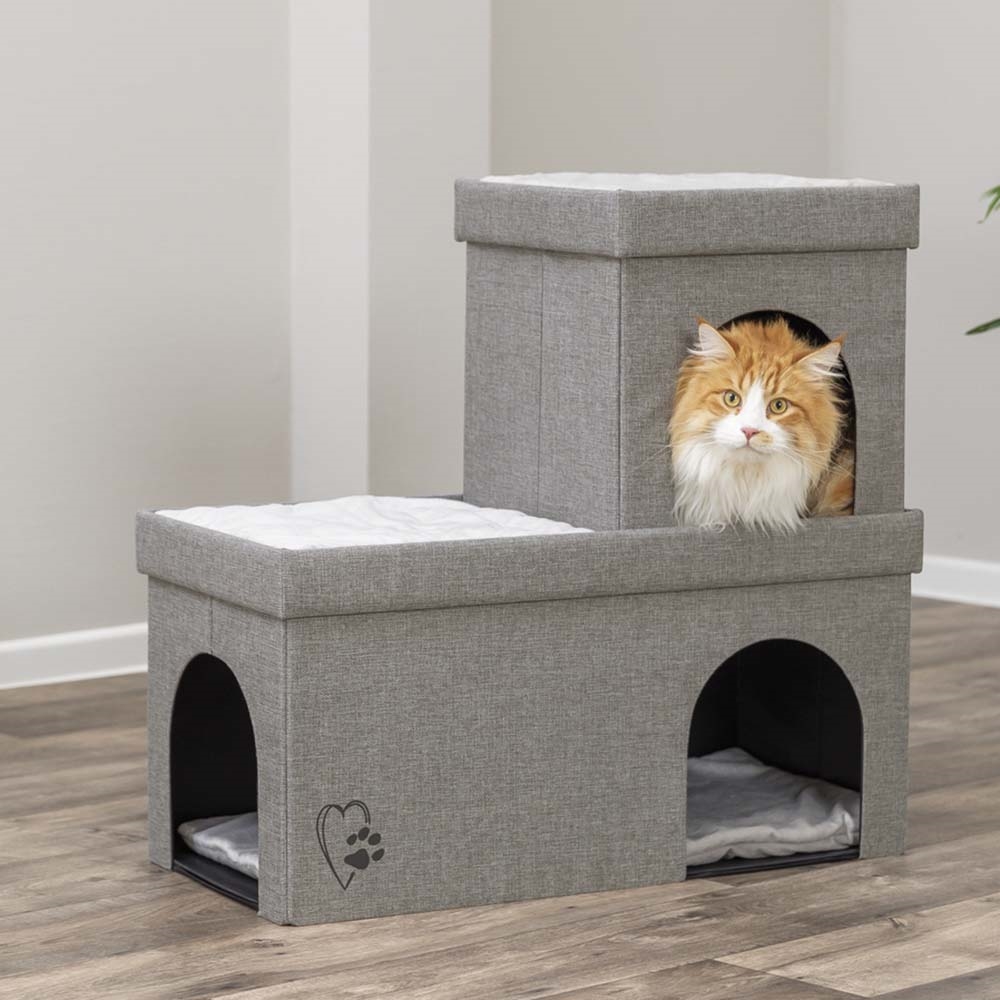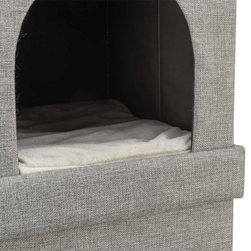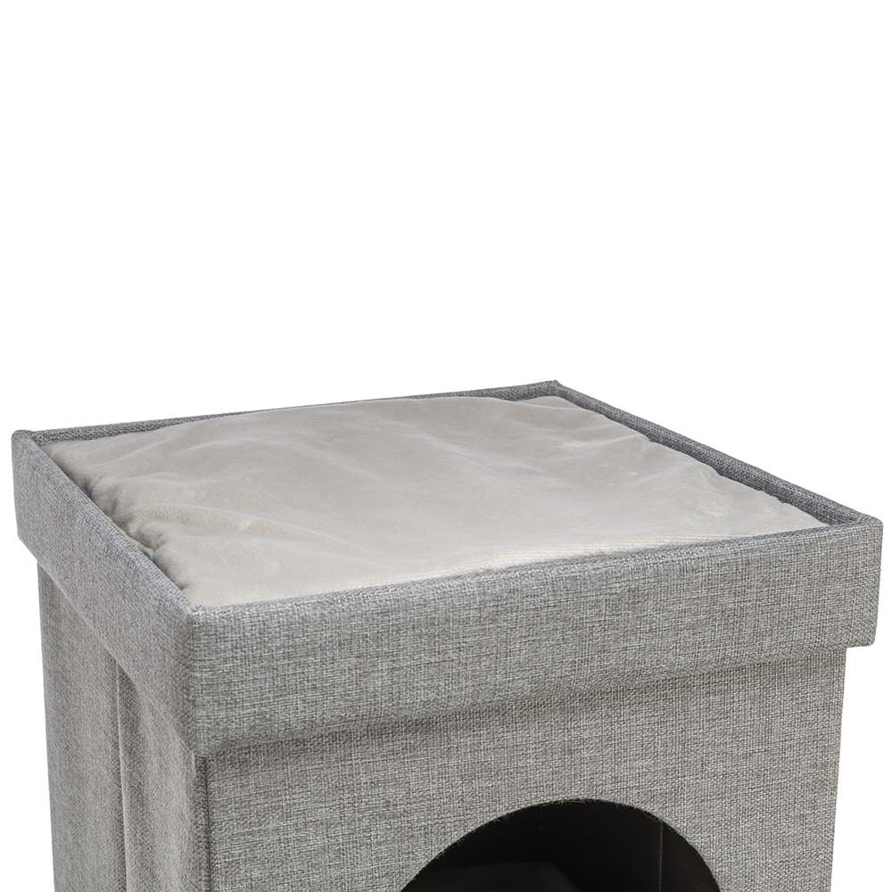 Denna söta kattgrotta har två våningar, med en grotta på varje våning. I båda grottorna och på båda liggplatserna finns det en tunn mjuk kudde.