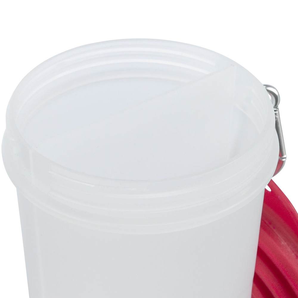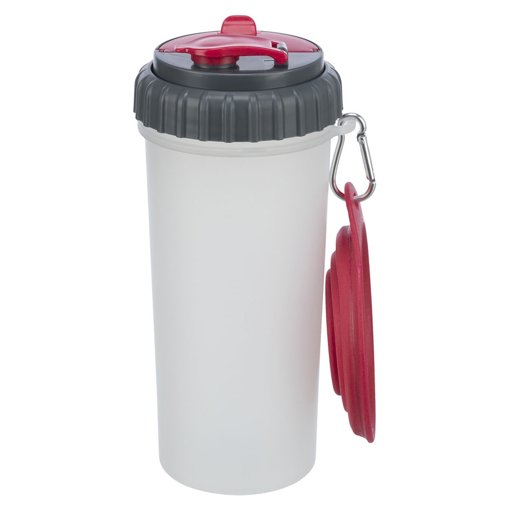 Det finns en metallkarbinhake som gör det lätt att fästa behållaren, och den inkluderar också en reseskål gjord av silikon, som är praktisk att använda på språng.
