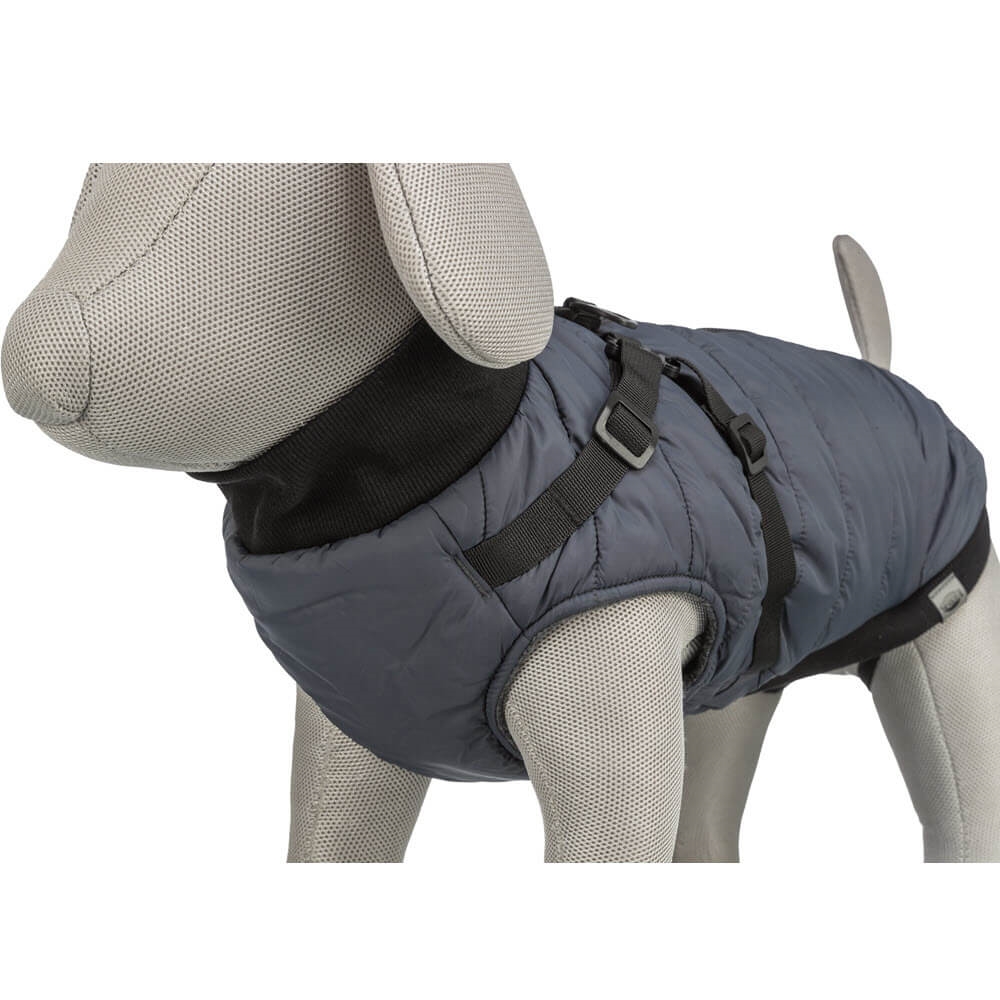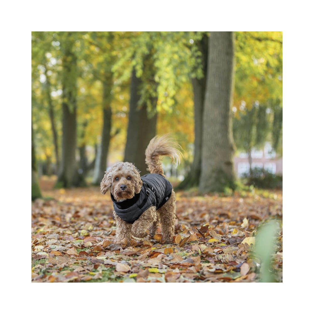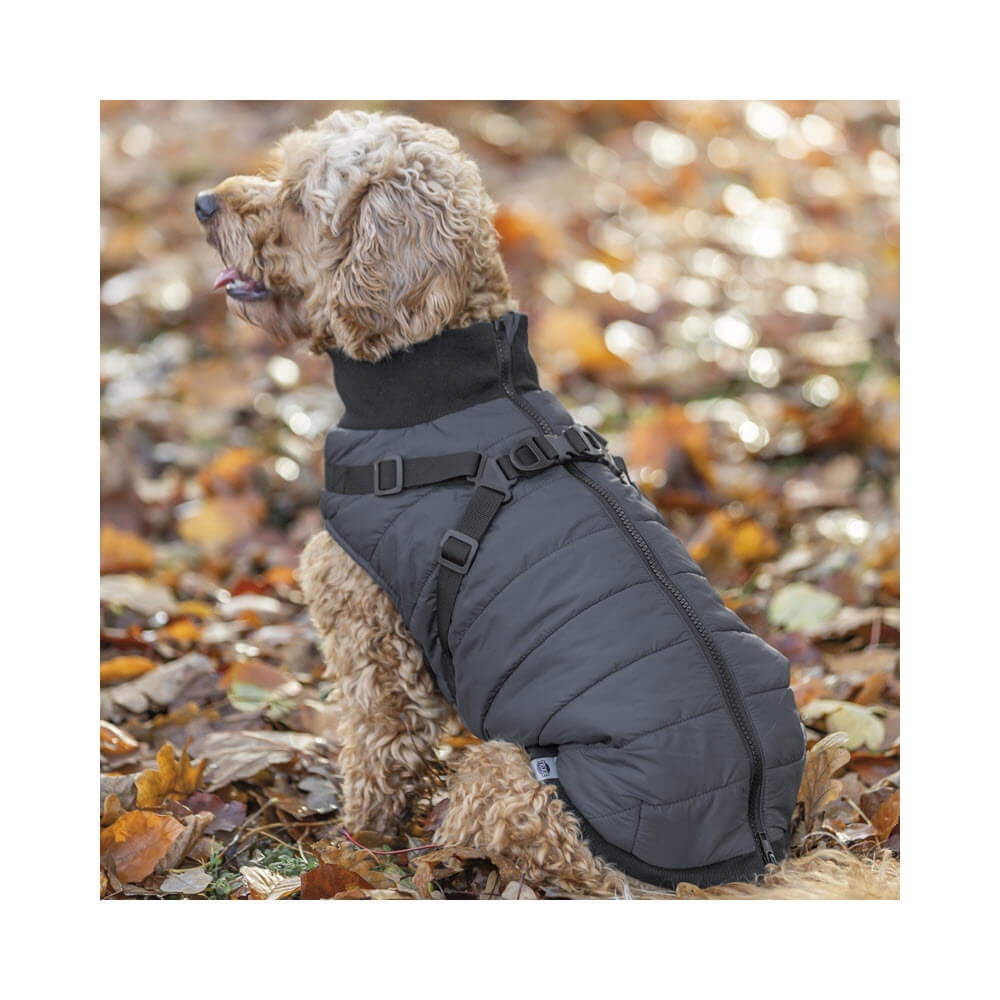 Denna smarta hundjacka är utrustad med en sele på ryggen, så du inte själv behöver sätta på hunden en sele. Jackan är gjord i polyester med invändigt fleecefoder. Jackan är härligt fluffig, med en skön vaddering.
